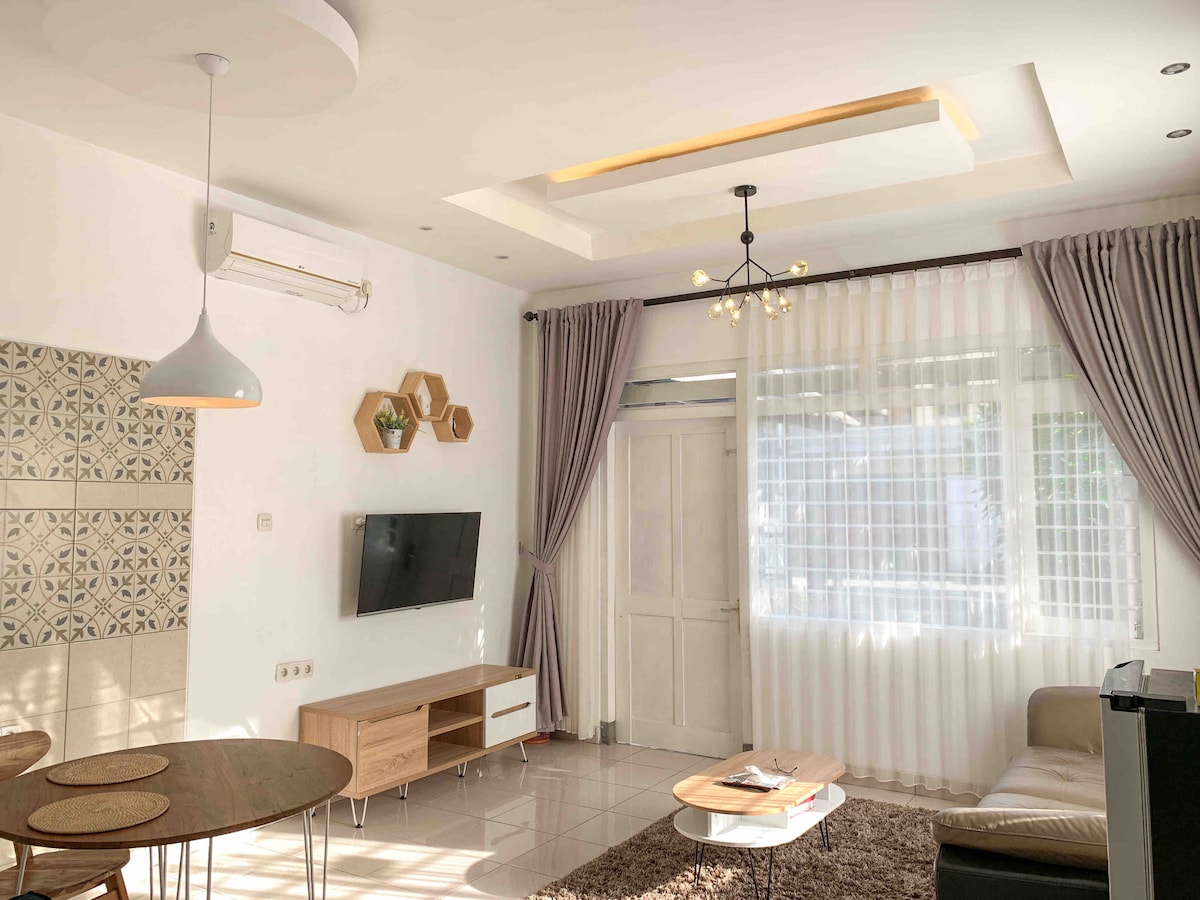 Madani Tiny House – a bright 1BR suite in Ngaglik, Sleman. A simple, cozy stay with a comfortable bed, AC, Smart TV, and a small dining corner. Large windows bring in warm natural light. You’ll have a private bathroom, a compact kitchen for light cooking, and a washing machine for longer stays. There’s also a small patio for coffee or relaxing. Quiet neighborhood, yet close to cafés, minimarkets, and main roads. Perfect for solo travelers, couples, or short work trips in Yogyakarta.