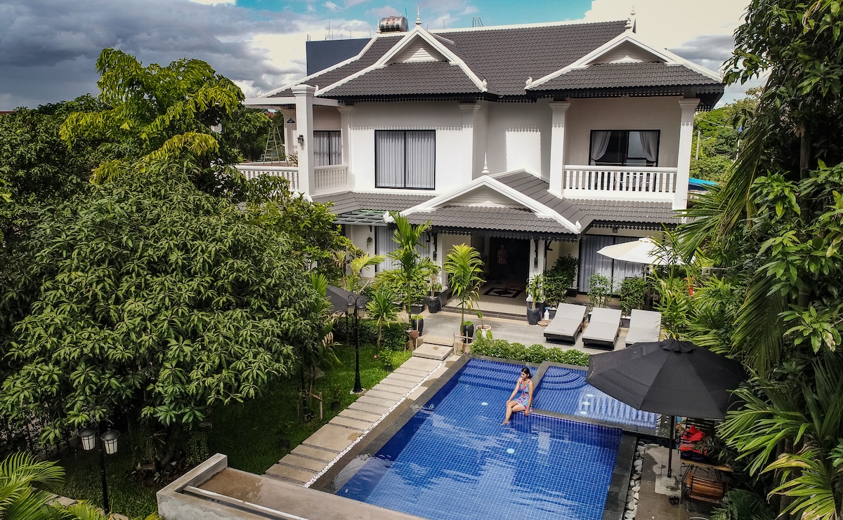 Rumah butik yang luas dengan 5 bilik tidur dengan kolam renang persendirian, dibina dalam gaya unik seni bina Khmer dan Barat dengan suasana oasis, yang terletak berhampiran pasar tempatan terbesar Siem Reap, hanya 10 minit dari pusat bandar Pub Street, dan 15 minit ke Angkor Wat yang menakjubkan. Vila yang indah ini sesuai untuk kumpulan atau keluarga untuk menikmati penginapan persendirian dan berasa seolah-olah anda berada di rumah. Makanan Khmer tulen, pengangkutan/lawatan berpandu, dan pemindahan lapangan terbang boleh diatur semasa penginapan.