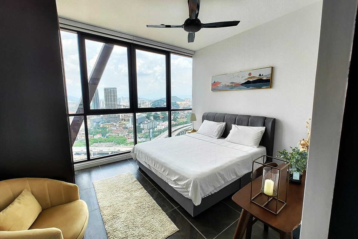 Pemandangan Menara Berkembar KLCC yang tidak terhalang, Merdeka 118 (Bangunan Tertinggi ke-2), Menara KL. Di dalam unit, panel tingkap lantai ke siling memberikan pemandangan latar langit panorama, dan matahari terbenam ambar yang menakjubkan di ufuk. Di tingkat bawah, 1 bilik tidur King dan bilik yang lebih kecil dengan tilam lantai disediakan. Tingkat atas, 1 bilik tidur King dan bilik mandi luas dengan tab mandi mewah untuk mandi air panas yang panjang. Manjakan diri anda di kolam renang infiniti tingkat 48 dengan panorama yang menakjubkan di semua bangunan pencakar langit KL yang ikonik.