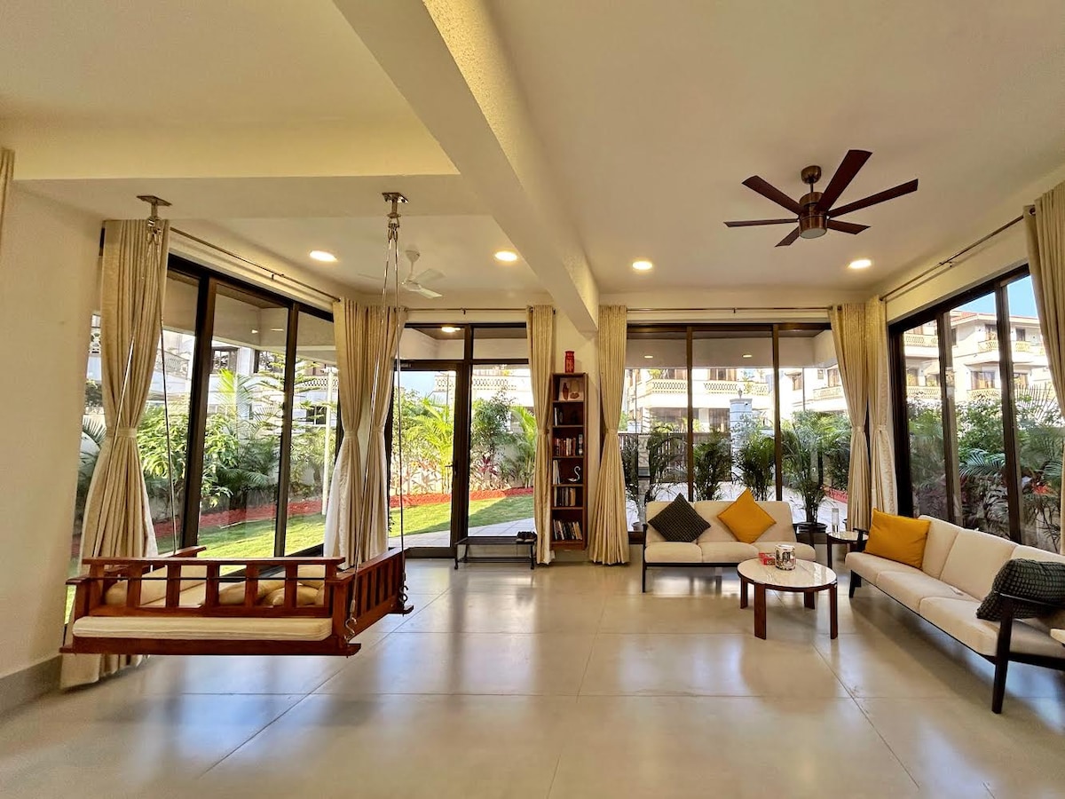 Loaded with superior amenities Cozy Villa is a pet-friendly property that makes for an entire package of comfort, entertainment, nature and luxury. It has 4 bedrooms, 5 bathrooms, a fully furnished living area, a dining area, a kitchen, a terrace and an outdoor temperature-controlled pool. Every bedroom has an attached bathroom and a balcony. The terrace is well-lit with fairy lights and comfortable chairs that open up to the expansive view of the entire city.