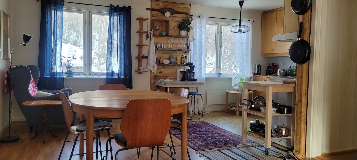 Apartmen yang diubah suai sepenuhnya dengan teres – keselesaan moden, lokasi yang tenang (2 km dari pusat bandar Rjukan) Apartmen tanah liat yang cerah dan cantik. Katil di bilik tidur no. 1 mempunyai katil double 200x180 cm. Bilik tidur no. 2 mempunyai katil double 200x120 cm. Mesin pencuci pinggan, mesin basuh dan pengering jatuh. Tuala dan cadar termasuk dalam harga. Pusat di Rjukan. Juga mempunyai bilik pengeringan sendiri di ruang bawah tanah untuk pakaian ski dan peralatan memanjat untuk digunakan. Ruang tamu mempunyai TV 75", lounge 3 tempat duduk dan 2 kerusi. ✔Tempat letak kenderaan percuma. Stesen pengecasan kira-kira 200m