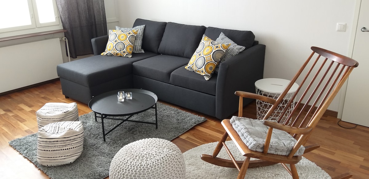 The beautifully renovated one bedroom apartment will serve you during your stay. The apartment has a sauna and a washing machine. The kitchen has just been renovated and is equipped with with modern equipment. The bedroom has twin beds and the living room has a double sofa bed. If necessary, a bed for a baby is also provided. The apartment has a beautiful décor and large windows to the evening sun. Welcome!