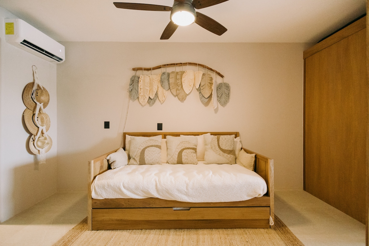 Tempat penginapan bergaya ini sesuai untuk perjalanan berkumpulan. Dengan 2 Katil King di bilik tidur persendirian, masing-masing dengan bilik mandi persendirian mereka sendiri, anda akan menyukai peluang rehat yang tenang ini. Halaman persendirian yang jarang ditemui, menghadap ke Taman Negara, ia adalah tempat perlindungan alam semula jadi. Dengan katil Sofa Queen yang boleh ditarik keluar untuk kanak-kanak atau tetamu bermalam, tempat ini pasti akan menyenangkan. 20' siling di atas dapur dan patio atas bumbung yang besar untuk ruang luar untuk menikmati pengembaraan Huatulco anda. 5 minit berjalan kaki ke kedai, restoran dan bank.