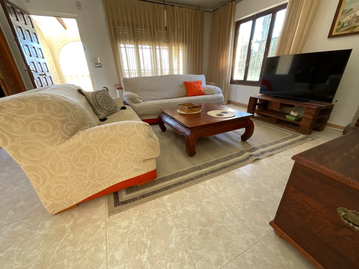 Banglo dengan barbeku dan patio kecil, sesuai untuk haiwan peliharaan. Mempunyai 1 bilik tidur dengan katil kelamin. Bilik mandi dengan pancuran mandi, ruang tamu-makan, dapur lengkap, ketuhar, ketuhar gelombang mikro dan mesin basuh. Ia mempunyai kolam renang komuniti, WIFI (600MB), penyaman udara dan haba. 5km dari Benidorm, tempat letak kereta yang mudah, kawasan dan pembangunan yang tenang 20 minit berjalan kaki dari Playa del Albir. Kami mesra haiwan peliharaan.