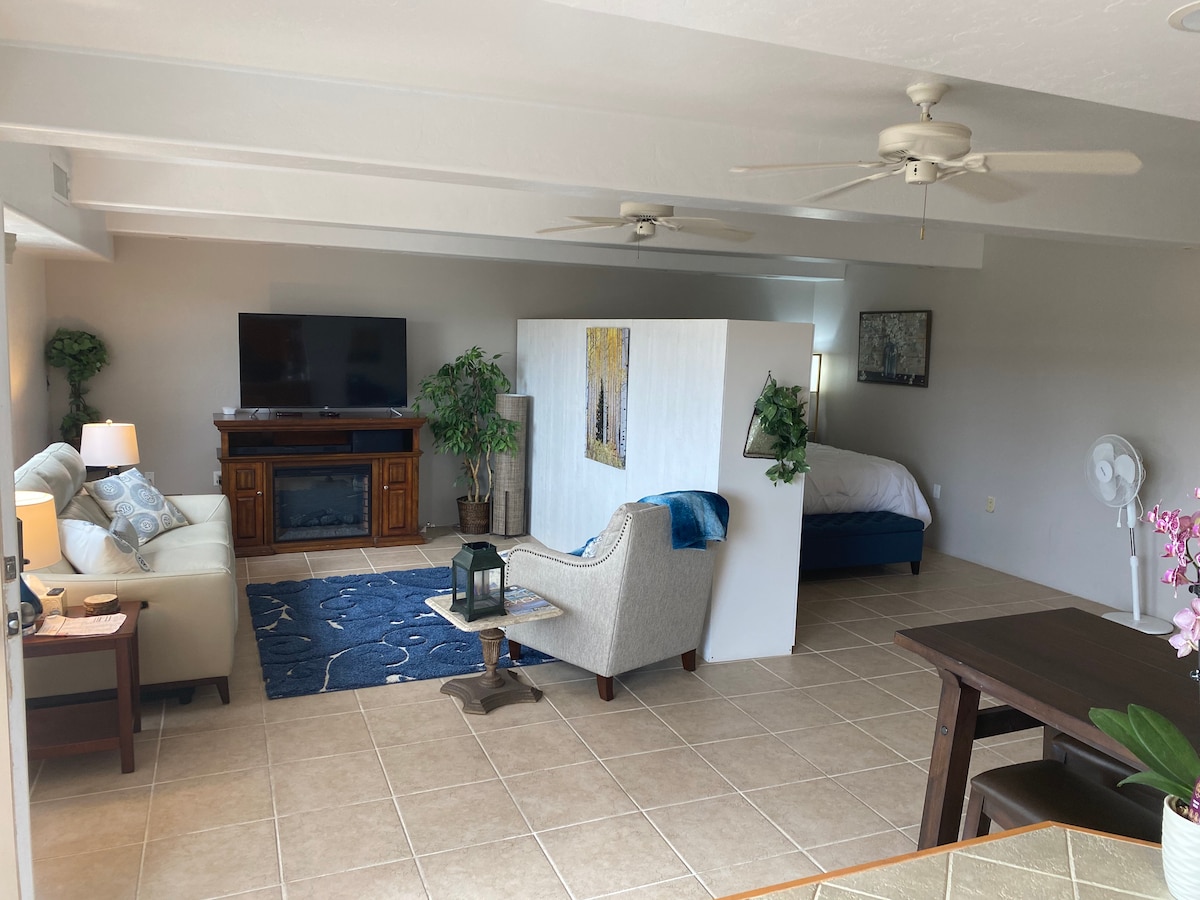 1 bilik tidur - Katil Queen, 1 bilik mandi, sofa, dapur kecil, halaman. TV pintar 55"baharu, Wi-Fi berkelajuan tinggi. Studio yang terletak di West El Paso berhampiran dengan I-10. Dapur Kecil ini dilengkapi dengan peti sejuk, ketuhar gelombang mikro, ketuhar pembakar roti konveksi, pembuat kopi, dapur memasak elektrik, pengisar, 2 keping pembakar roti, peralatan memasak, pinggan, cawan, gelas, sudu garfu, dll. Kerusi tinggi dan permainan pack'n tersedia atas permintaan.