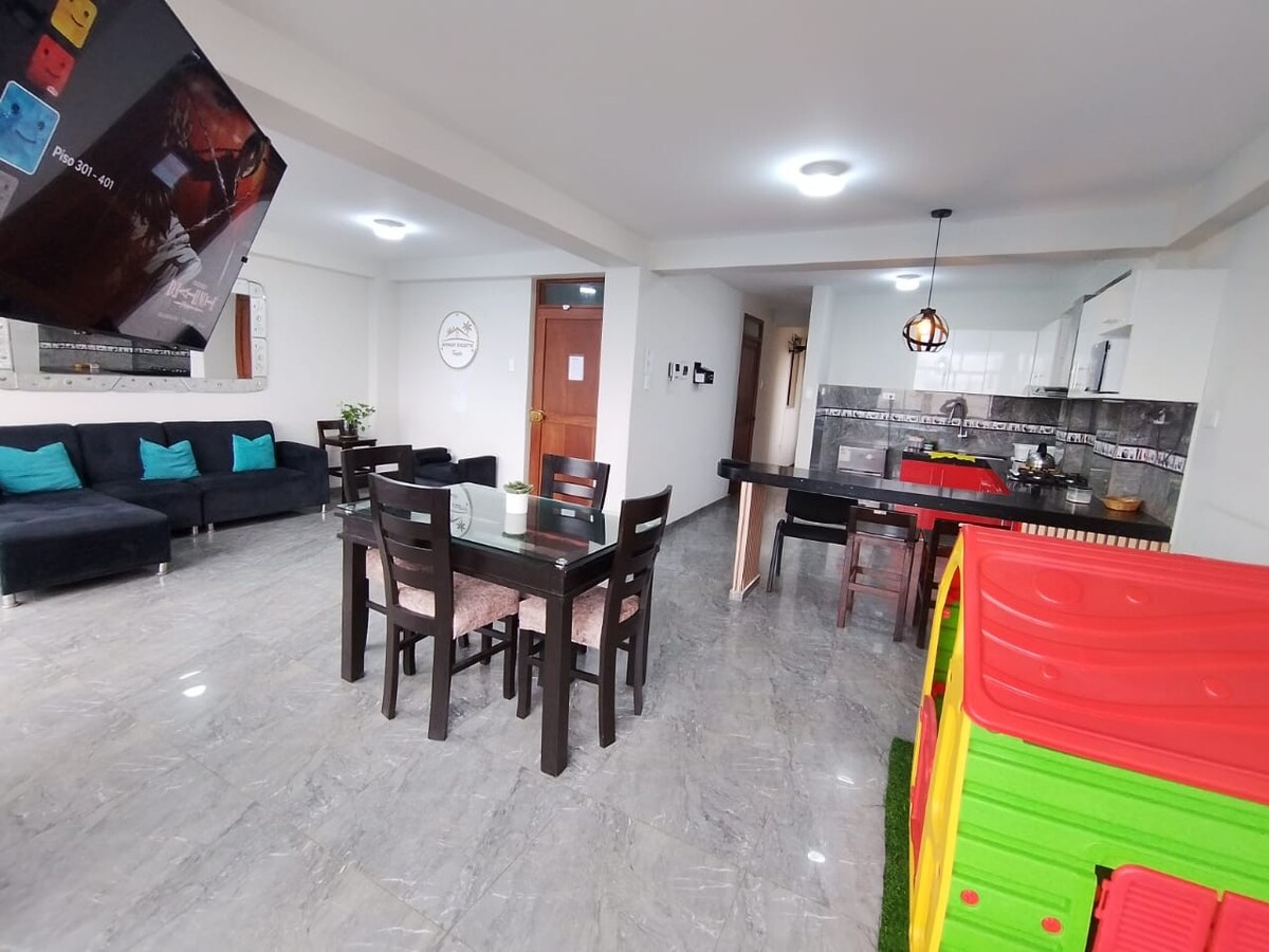Apartmen yang selesa dan selamat terletak di tingkat 3 BANGUNAN KELUARGA kami, berhampiran dengan segala-galanya. Di tingkat 1 anda akan menemui bilik bawah tanah dengan keperluan asas. Juga dengan lokasi strategik: 10 minit dari Plaza de Armas dan pusat membeli-belah; 5 minit dari UNC, Terminal Bas dan Alameda de los Incas; 18 minit dari Lapangan Terbang. Berhampiran anda akan menemui pasar tempatan, farmasi, restoran, dll. Saya dan keluarga sedia membantu anda menikmati penginapan anda.