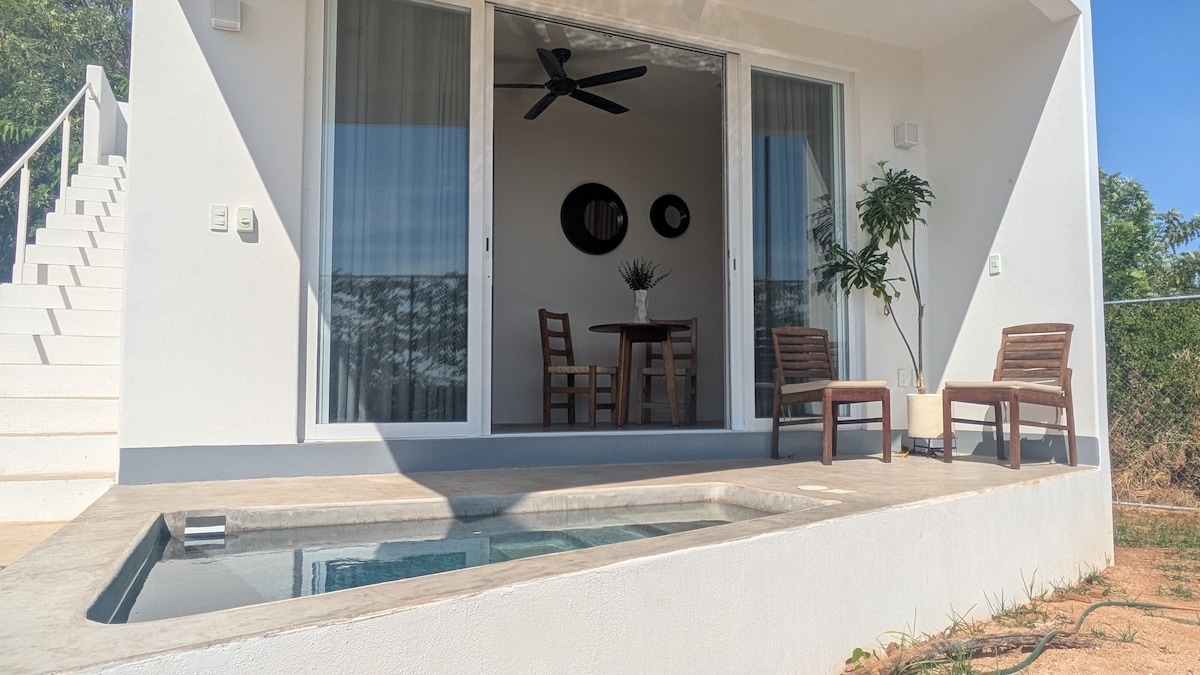 Terletak di Punta Zicatela, hanya beberapa minit berjalan kaki dari pantai, restoran, dan tarikan lain. Dengan internet yang sangat baik, kedua-dua gentian optik dan Starlink. Katil saiz queen, AC, pengudar, dapur kecil dengan peti sejuk, pembuat kopi dan penapis air. Bilik mandi penuh, dan almari kecil. Ia mempunyai balkoni dengan meja kecil dan dua kerusi, dan bidai kayu dengan pemandangan ke taman. Selain itu, ia mempunyai teres persendirian di tingkat dua, dengan pemandangan yang indah, meja kecil dan kerusi.