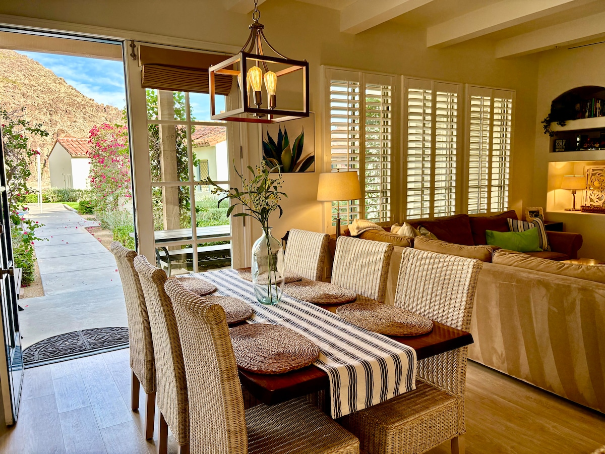 La Quinta short-term permit #064335; 2 bedrooms/2 bathrooms, max occupancy 6. Pet friendly, dogs only. $100 pet fee applies Escape to this 2BR, 3BA two-story Spa Villa nestled behind La Quinta Resort. The first floor features a cozy living/dining area, full kitchen with ample cookware, and a private bedroom suite with a walk-in shower and soaking tub. Upstairs, a spacious suite with a sitting area and separate entrance awaits. Enjoy two private patios, mountain views, and direct access to the p