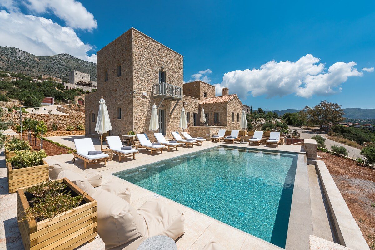Percutian yang terkenal ini menggabungkan pemandangan laut panorama, taman yang tenang, dan seni bina batu abadi dengan kolam renang infiniti, tempat makan alfresco, dan hiasan dalaman yang mewah, mewujudkan tempat perlindungan yang indah. Direka untuk menerima sehingga 8 tetamu yang arif merentasi empat bilik tidur yang digayakan dengan teliti, ia menawarkan gabungan ruang tamu dalaman dan luaran yang harmoni. Sesuai untuk percutian sepanjang musim, syurga layan diri ini menggabungkan warisan Maniot tradisional dengan keanggunan moden yang halus.
