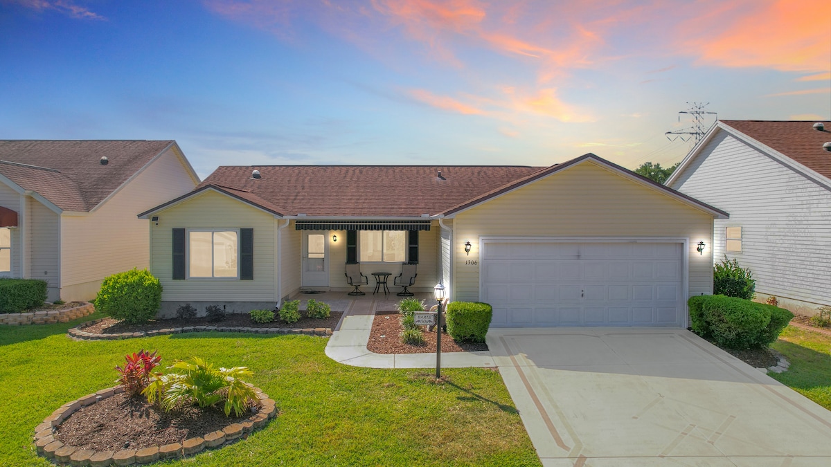 Percutian menawan di The Villages. KERETA GOLF TERMASUK dengan syarat & batasan lihat di bawah. 2BR/2BA kami menawarkan peningkatan termasuk pancuran mandi, katil queen yang boleh dilaraskan, dapur moden, pendiang elektrik & TV besar. Anda akan mendapat akses kepada pelbagai kemudahan, golf percuma di 41 padang eksekutif hingga kolam renang yang menyegarkan, tenis, pickleball & banyak lagi. The Villages mengenakan yuran $50 untuk dua ID gaya hidup. Sila tempah penginapan anda dengan kami, & alami kehidupan mewah di sewaan percutian kami di The Villages