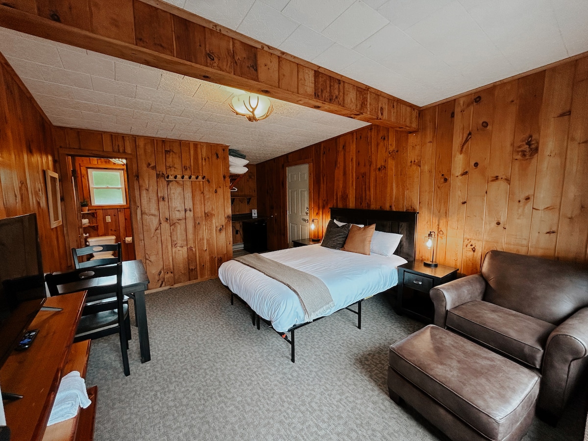 Studio buatan tangan yang direka untuk hubungan. Berendam, berehat dan tenangkan diri di jakuzi peribadi anda selepas meneroka Lake George. King Studio ini menggabungkan pesona desa dengan keselesaan. Dinding pain yang hangat, perabot buatan tangan dan hiasan gaya pondok mewujudkan latar belakang yang sempurna untuk percutian romantik. Bersantai di jakuzi, tuang segelas wain dan rasai kehangatan Adirondack. Sama ada anda meraikan ulang tahun, melarikan diri dari bandar atau hanya perlu berehat, ruang ini direka untuk bersantai dan berhubung semula.
