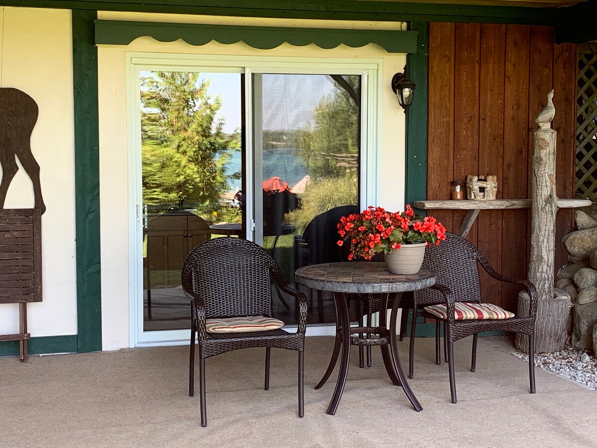 Sila cari platform tempahan kami di laman web kami. Suite tingkat bawah yang cerah dengan katil King di Green Bay Lodge di Lake Manitou. Dermaga dengan pemandangan tasik. Terletak di tengah-tengah, tempat percutian yang sempurna untuk melihat pulau ajaib kami. Damai dan tenang, Green Bay Lodge adalah alam semula jadi yang terbaik. Sesuai untuk pengembaraan luar! Ikan, berenang, berkanu, kembara berjalan kaki, kereta salji, ikan ais, kasut salji, ski merentas desa dan pemandangan bintang ke hati anda. Bersantai dan nikmati minuman di tepi unggun api luar.