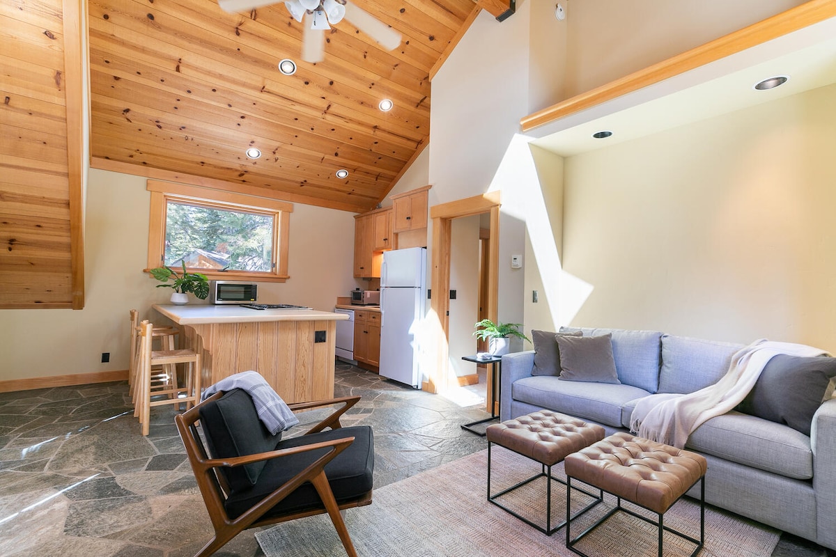 Tempat persembunyian gunung yang tenang yang direka untuk dua orang. Nikmati suite persendirian anda yang terpisah. Di dalam, berehat dengan mudah di tepi api atau di satu katil queen, makan dan sediakan makanan anda di dapur kecil yang berfungsi sepenuhnya, bekerja dari jauh menggunakan akses internet berkelajuan tinggi atau tonton filem kegemaran anda di TV pintar. Di luar, nikmati akses kepada hiking, berbasikal gunung, ski merentas desa dan berbasikal salji di luar pintu. Ski menuruni bukit dan pantai Tahoe hanya beberapa minit.