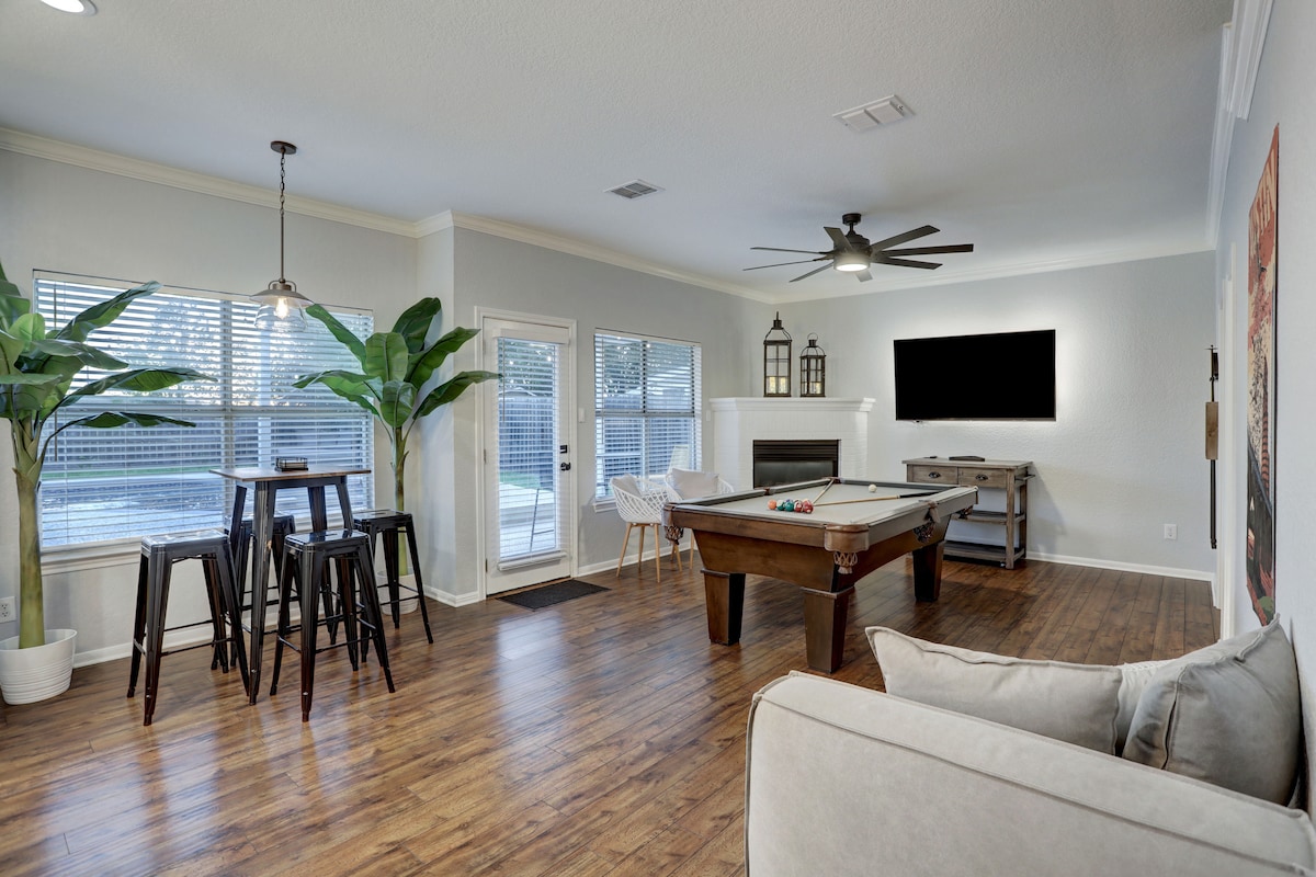 • Rumah 4 bilik tidur 2 tingkat seluas 2100+ kaki persegi • 2 kawasan patio persendirian, 1 payung tertutup & 1 w/LED • Kolam renang+Spa dengan katil siang & kerusi rehat yang juga boleh terapung di kolam renang *Perhatikan yuran $ 75 untuk pemanasan kolam renang semalam. Pemanasan spa $50 yuran sekali untuk seluruh penginapan. • Gameroom dengan meja pool & TV 65 inci • Teater Luar • Pemanduan singkat ke DT Round Rock dan hanya 20 minit memandu ke DT Austin. Dell Diamond. 5 min memandu • Luangkan sehari di taman air dalaman Kalahari (taman air dalaman paling hebat di dunia) 5 minit memandu