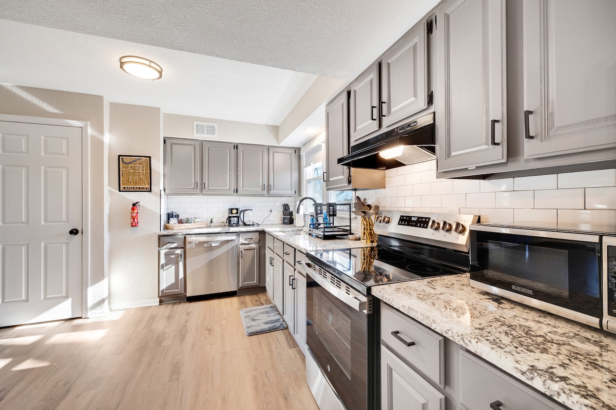 In downtown Lees Summit, our 2-bed, 1-bath Airbnb blends modern design with historic charm. Luxurious king-size bed in the master, a twin trundle bed in the guest room with dedicated workspace. Stylish bathroom with modern fixtures. Perfectly located for dining, shopping, and entertainment. Cozy living space, well-equipped kitchen. Fast WiFi. Your ideal home away from home in vibrant downtown. Just a short drive to Arrowhead / GEHA Field! Book now for an unforgettable Lee’s Summit adventure!