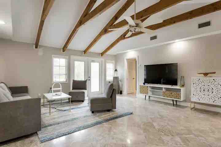 DUA BLOK KE PANTAI AWAM! Rumah percutian impian moden pantai yang diubahsuai sepenuhnya di tengah-tengah Deerfield Beach! Banyak ruang dengan halaman belakang persendirian/berpagar yang besar, ruang hijau & gril yang besar, mesin basuh-pengering: semua untuk kegunaan peribadi & eksklusif anda sendiri. Berjalan dua blok ke pantai awam, jeti, laluan pejalan kaki, hiburan malam & restoran yang menakjubkan. Meluncur, bot, memancing, berenang di lautan. Dua bilik tidur mewah & bersih & dua bilik mandi, + katil sofa queen. Kawasan makan sunroom yang cerah. Bonus bilik permainan Ping Pong!