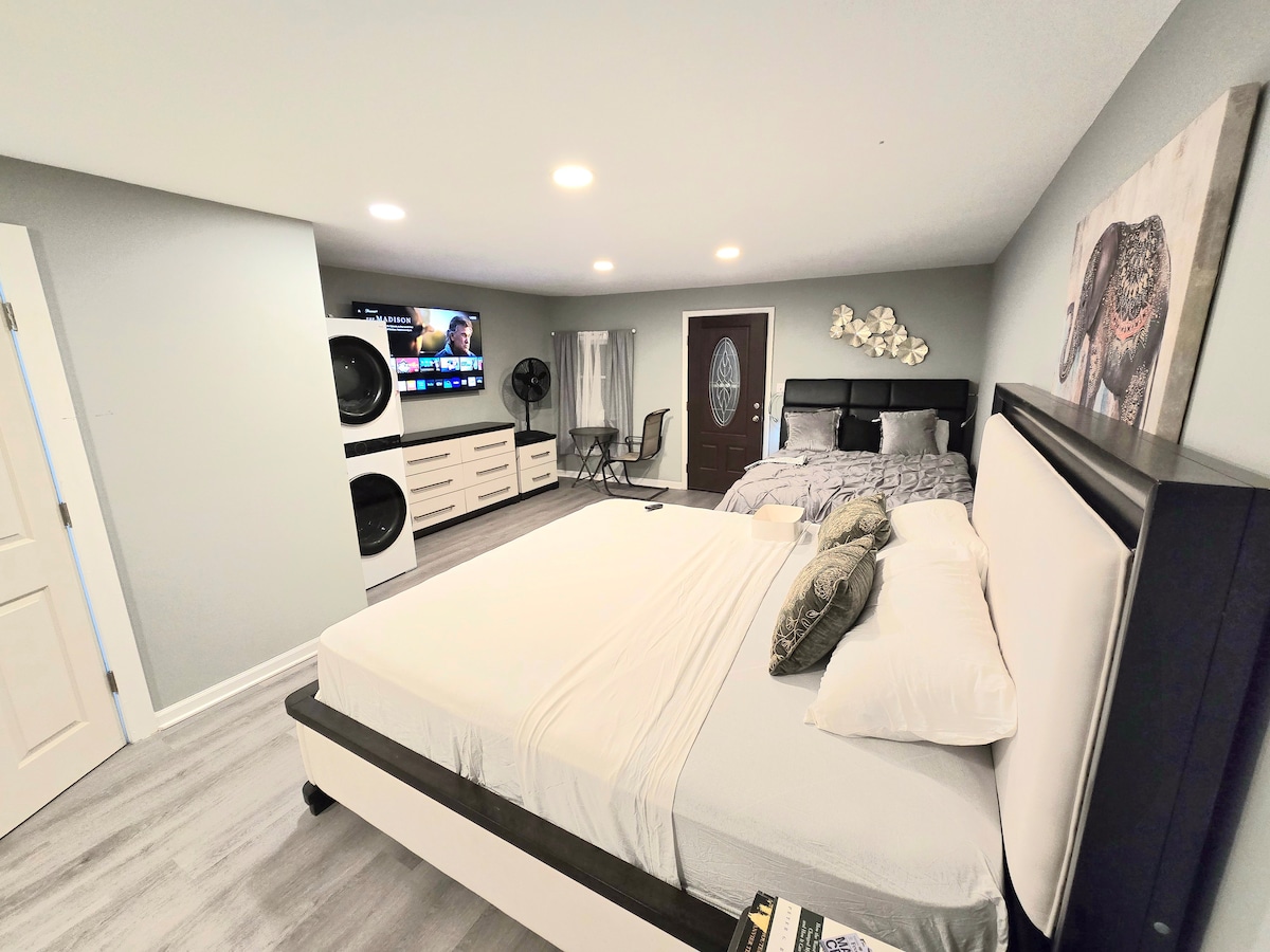 Relax at this peaceful place to stay. Nestled in a lush, natural setting, our secure and gated guest house offers the perfect blend of privacy and serenity. This charming one-room efficiency is designed for those who appreciate the quiet beauty of the outdoors. Restful Sleep on King-size bed after a long day of exploring. A fully equipped kitchen for your culinary needs and a clean, private bathroom. Entertainment: big-screen TV. Step outside to enjoy the beautiful outdoor surroundings.