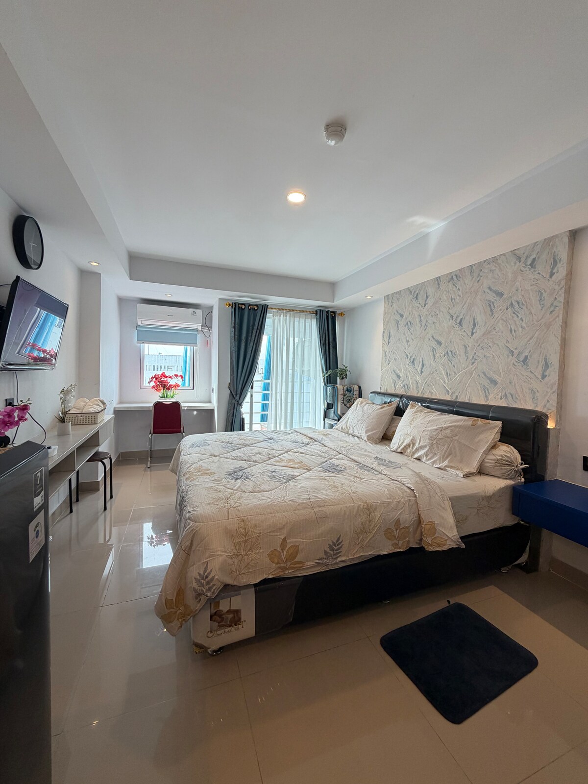 A peaceful, centrally located, studio apartment offering seamless self check-in. Amenities include: • Fully equipped kitchenette • TV • Bathroom with water heater • High-speed Wi-Fi • Iron • Fresh towels • Complimentary bathroom amenities (shampoo, soap, toothbrush, and toothpaste) Guests are welcome to enjoy complimentary access to the swimming pool and gym facilities. A refundable deposit of IDR 150,000 is required upon check-in and will be fully returned upon check-out, subject to no damages.