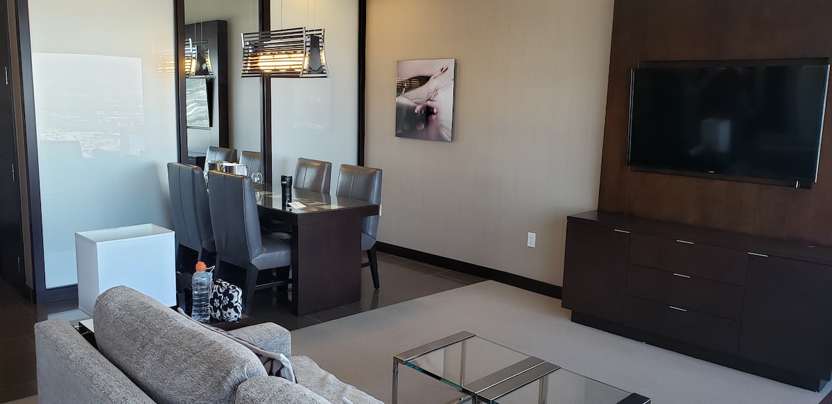 Suite Penthouse 1 bilik tidur 2 bilik mandi ultra moden ini adalah milik anda sepenuhnya. Nikmati ruang tamu yang luas dengan balkoni yang menampilkan pemandangan jalur yang menakjubkan! Disediakan sepenuhnya dengan tuala mewah, cadar kapas, tilam impian '& dapur penuh dengan semua jenis peralatan untuk sebarang tahap memasak. Nikmati penginapan gaya resort dengan akses kolam renang & gimnasium, akses terus ke kasino MGM, valet percuma, WIFI berkelajuan tinggi adalah salah satu daripada banyak pilihan hiburan. Jarak berjalan kaki ke jalur Las Vegas terkenal di dunia!