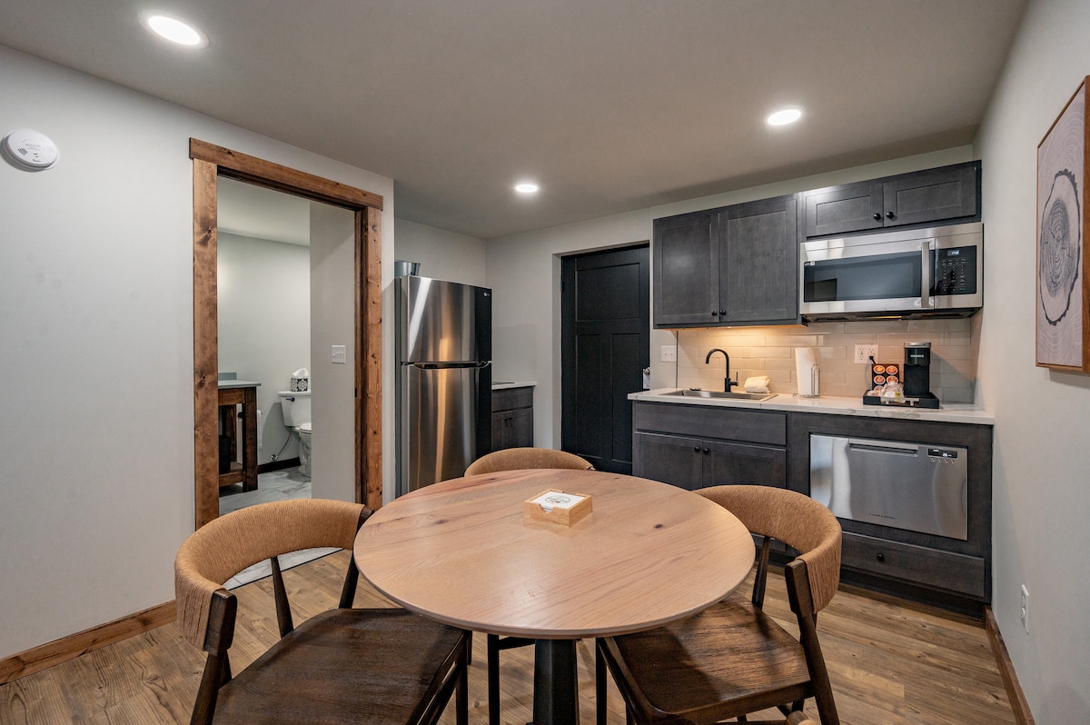 Unwind in this spacious retreat with soaring vaulted ceilings, two Queen beds, and a warm electric fireplace. The luxurious bathroom features a walk-in shower with quality bath products, while the kitchenette and Smart TV ensure a comfortable stay. Step onto the deck to breathe in the fresh mountain air before a morning stroll to the lake. Best of all, this is one of our dog-friendly rooms, so bring your canine companion and enjoy easy access to grass and trees right outside your door.