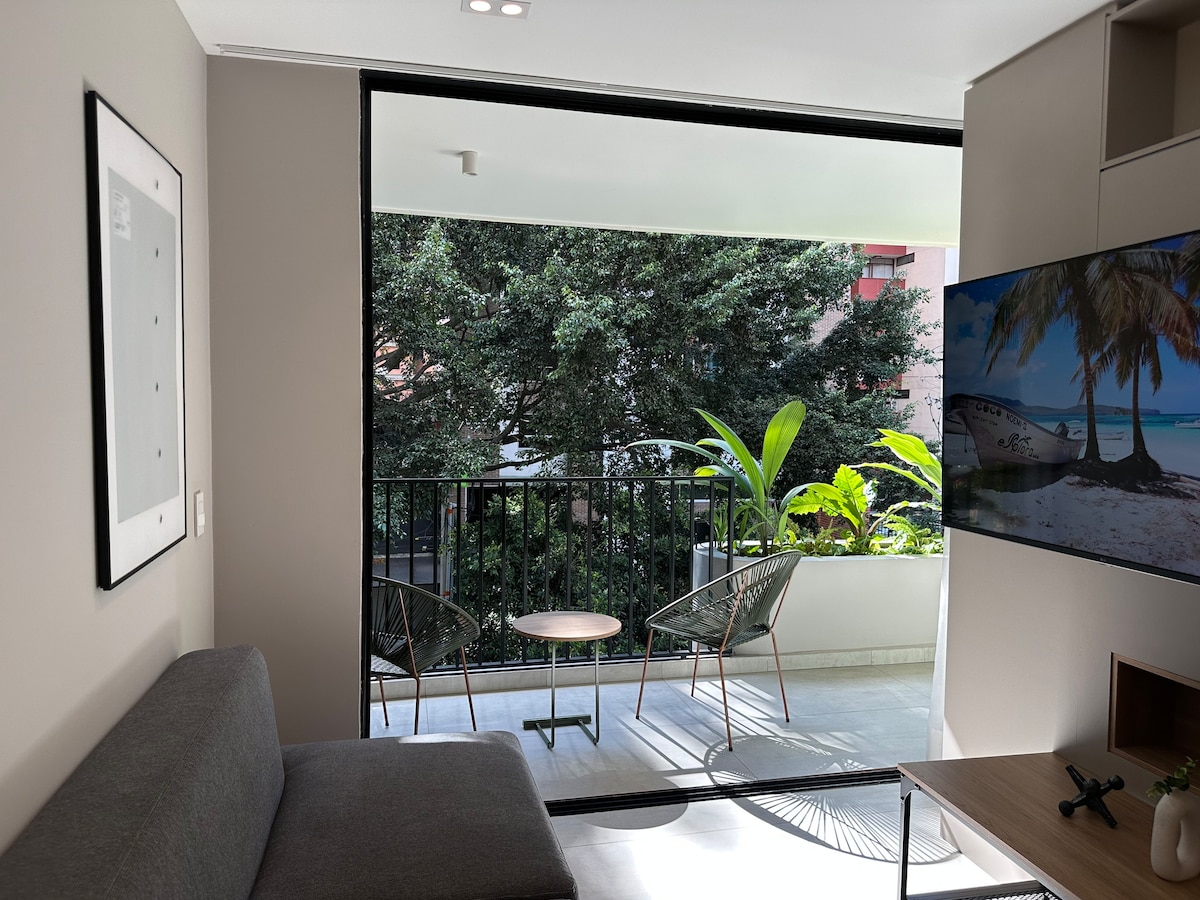 Modern top-floor studio in Laureles with mountain views and private balcony. 5-min walk to top dining & nightlife in Laureles. Features 1.5 baths, fast fiber WiFi, full kitchen, A/C, washer/dryer combo, Smart TV, with private + guest parking. Relax in a quiet, secure building with 24/7 security. Ideal for longer stays, digital nomads, and guests seeking comfort, space, and prime location. Please confirm your travel dates before booking. We prepare the apartment specifically for confirmed stays.