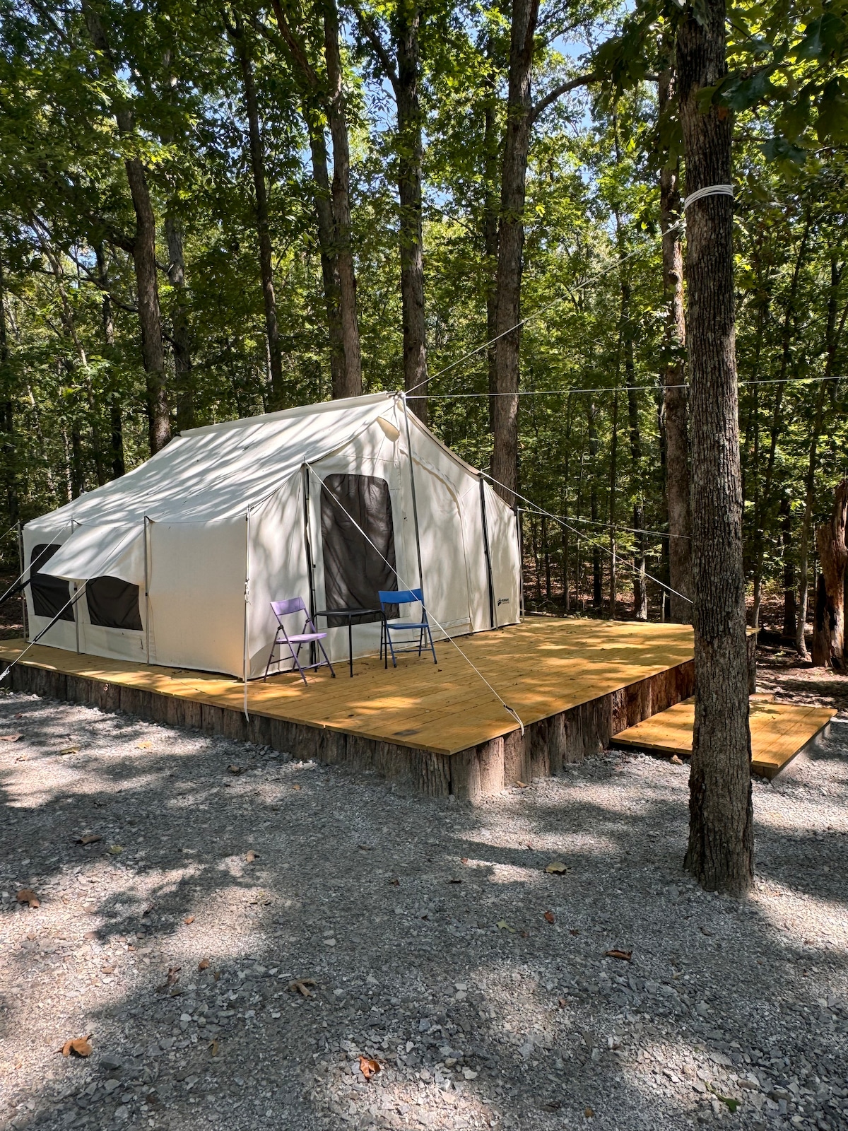 Jauhkan diri daripada semuanya apabila anda menginap di bawah bintang-bintang! Khemah kanvas yang indah ini mempunyai katil queen, meja dan kerusi yang selesa dengan ottoman. Terdapat tempat duduk luar di atas dek, meja dan kerusi di luar dan tempat yang indah untuk menikmati api petang! Kami mempunyai pancuran mandi luar dan bilik mandi untuk kegunaan anda bersama dengan dapur luar di mana kami sedia menawarkan kopi dan makanan bakar untuk sarapan apabila tersedia! Sila beritahu kami jika anda mahukan maklumat tersebut terlebih dahulu. Kami juga baru sahaja memasang tenaga solar!