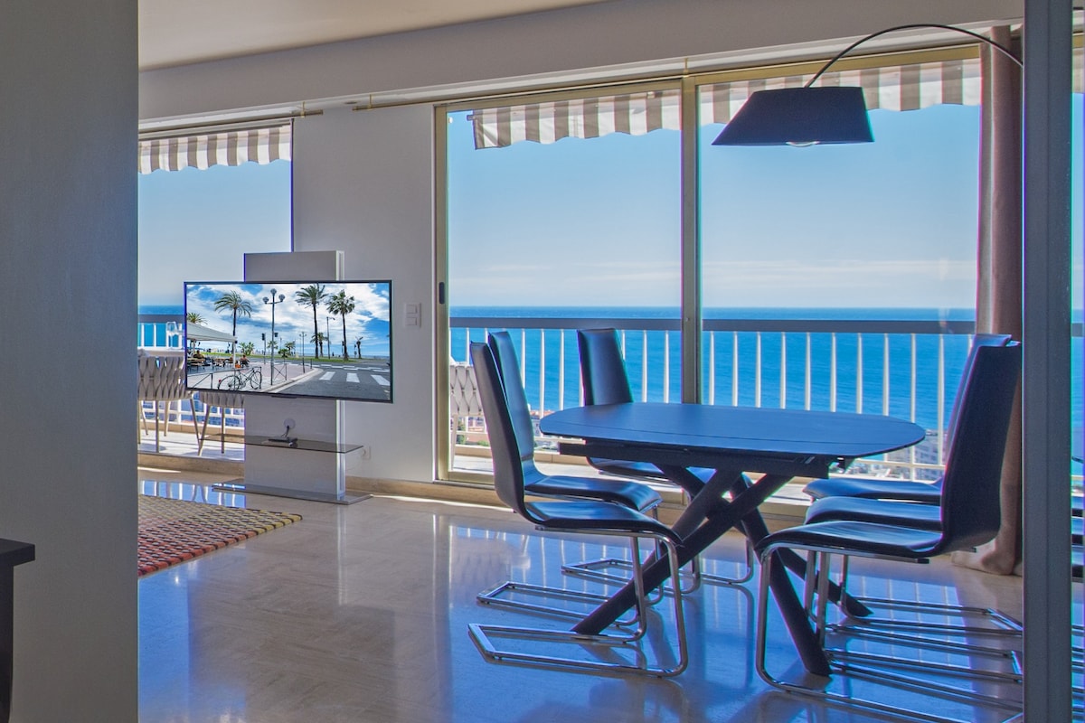 Di tingkat 6 kediaman dengan asc., apartmen ini menggabungkan kemewahan dan fungsi. Nikmati pemandangan Teluk Nice yang menakjubkan dari ruang tamu yang bermandikan cahaya yang dipanjangkan oleh teres. Setiap bilik menawarkan katil bersaiz king dan bilik mandi dalam. WiFi pantas, Tempat letak kenderaan tersedia. Kedai serbaneka di bahagian bawah bangunan.