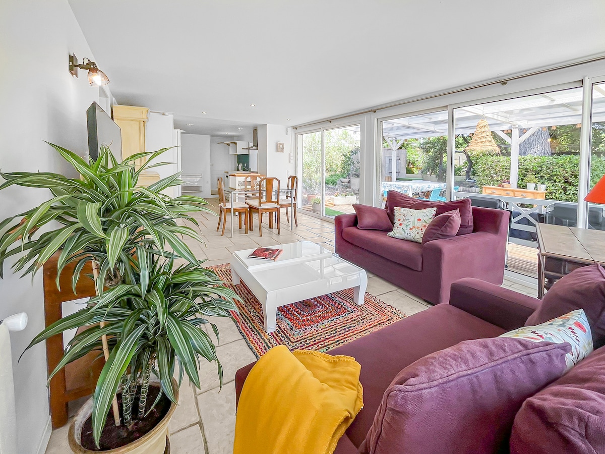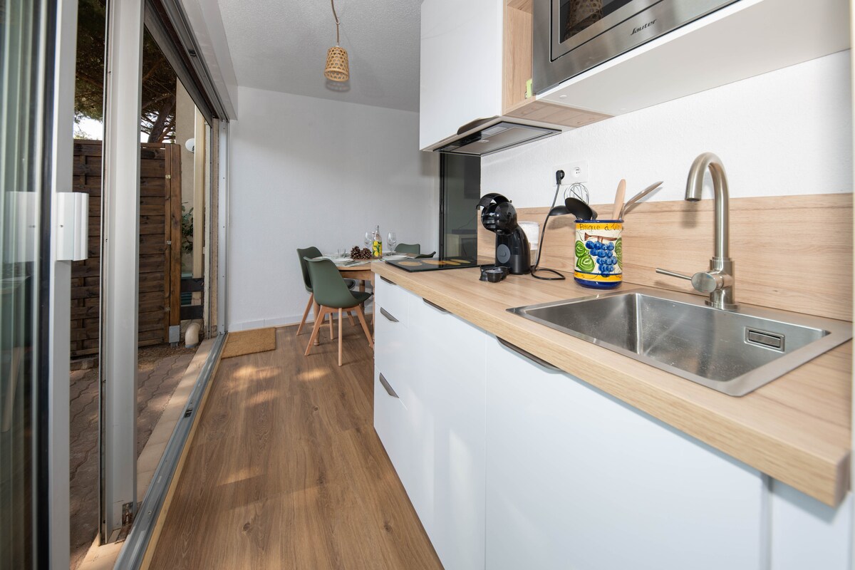 ☀️ Selamat datang ke Blanc des Pins, 🛜 Apartmen dengan taman persendirian dan tertutup, dilengkapi dengan TV bersambung dan sambungan Gentian Berkelajuan Sangat Tinggi. ⛱️ Tempat tinggal selamat dengan kolam renang dan tempat letak kereta persendirian, hanya 500 meter dari laut. 🐾 Direka untuk 4 pengembara (sehingga 6 bergantung pada keadaan), sesuai untuk keluarga dan haiwan peliharaan. 🧺 Cadar katil disediakan, untuk mengembara dengan semangat bebas.