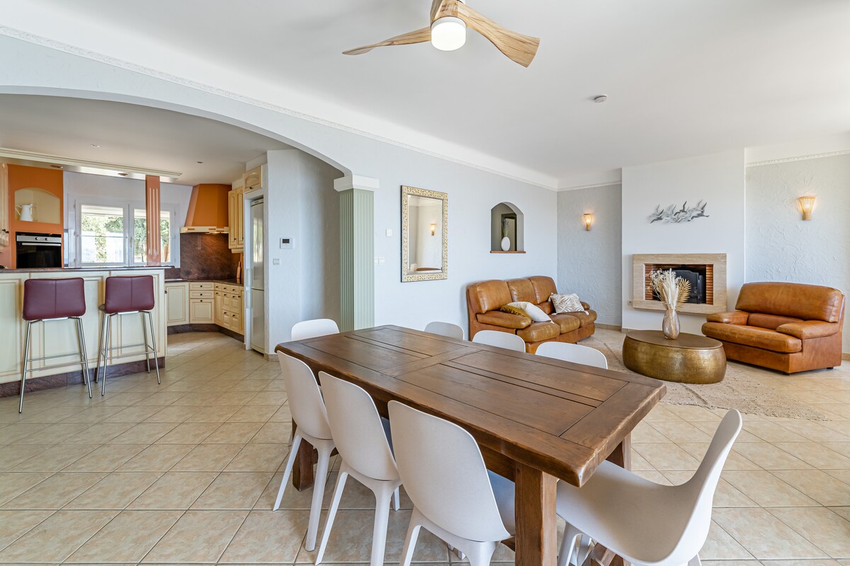 Vila kontemporari seluas 170m ² dengan kolam infiniti yang dipanaskan, pemandangan laut penuh. 500 meter dari pantai Saint Clair yang indah (5 minit berjalan kaki). 4 bilik tidur besar dan 3 bilik air untuk menampung 8 orang dengan selesa Penginapan pelancong berperabot 5 bintang Suasana yang kemas dan mesra dalam suasana Saint-Clair du Lavandou yang luar biasa. Lokasi yang sangat senyap end cul-de-sac. Pelabuhan dan kampung Lavandou 20 menit berjalan kaki.