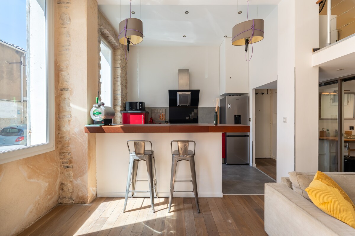 Di kaki tangga Cours Julien! Juga 10 minit berjalan kaki dari pelabuhan lama, loteng 50 m2 ini, di tingkat bawah, boleh memuatkan empat orang dan sesuai untuk penginapan pelancong atau perniagaan. Ia termasuk bilik tidur dengan katil double, mezzanine dengan katil double (boleh ditukar kepada 2 katil single), bilik mandi, dapur lengkap, ruang makan dan ruang tamu dengan sofa untuk berehat selepas hari yang sengit.