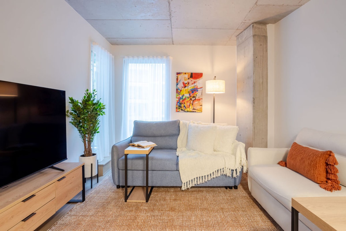Nikmati penginapan anda di pusat bandar ! Kemewahan pusat bandar TDC 2 baru dengan akses terus ke Bell Center! Nikmati keselesaan di kondominium satu bilik tidur kami yang berperabot lengkap dan lengkap dengan balkoni peribadi sendiri! Penginapan anda termasuk akses kepada sauna, pool, gym, skylounge, games room, lounge dan teres dengan berbilang barbeku. Tempat letak kereta bawah tanah percuma, dengan kereta api bawah tanah hanya beberapa minit jauhnya. Tanpa melangkah keluar, bandar ini milik anda untuk diterokai. Selain itu, bersantai dengan Netflix percuma untuk penginapan yang sempurna