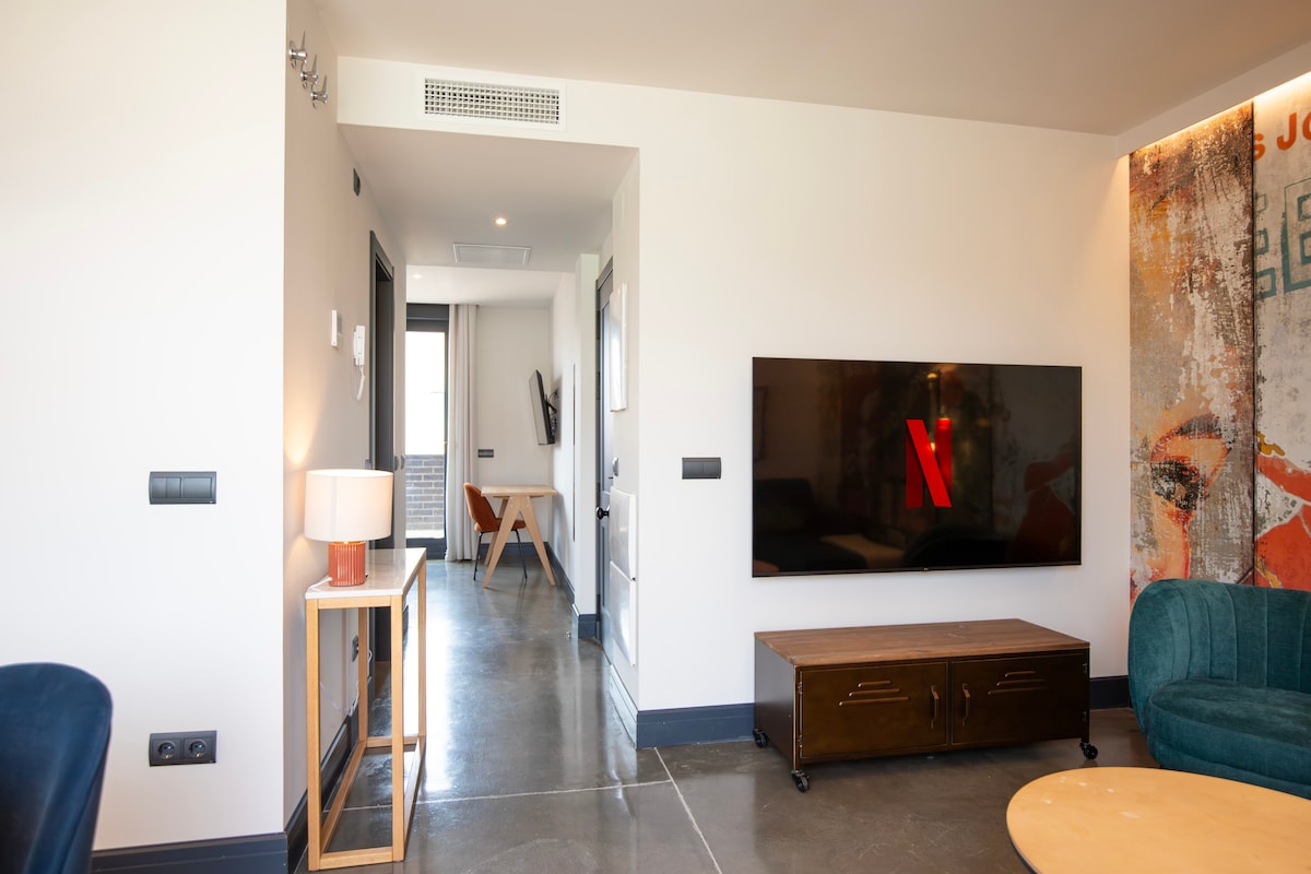 Magnificent 45 square meter apartment in the heart of Madrid. With spectacular design and decoration, spacious areas, and high ceilings, the apartment is equipped with everything you need for your stay in Madrid. The living room has three balconies overlooking the street that provide great brightness to the flat. The bedroom has an en-suite bathroom and a work desk. From the apartment, you can walk to almost all the iconic points of Madrid.