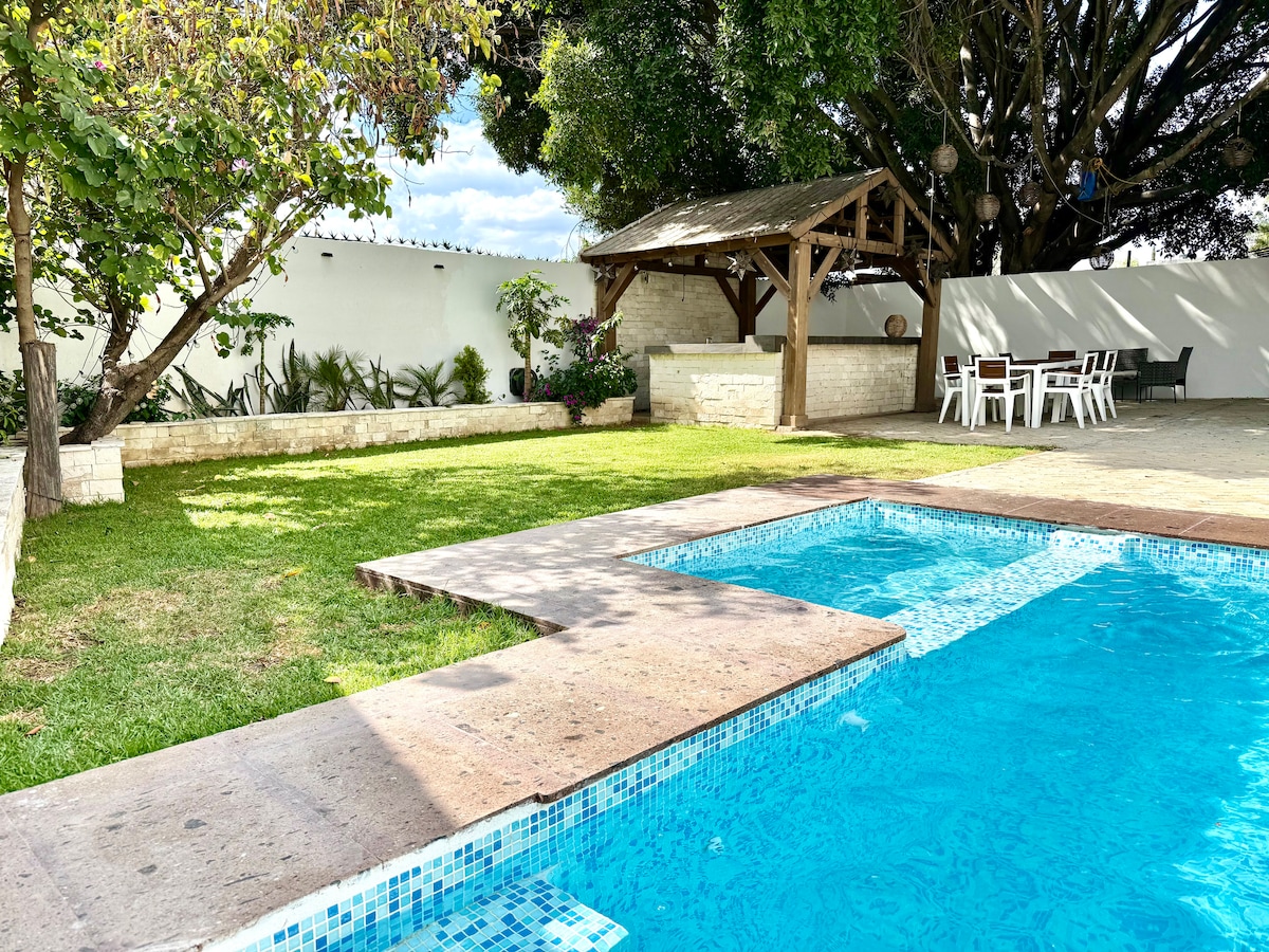Este alojamiento único tiene mucho espacio para que disfrutes con tu familia o amigos. Cuenta con 4 recamaras, 2 salas, 2 comedores, cocina completa, cuenta con 3 baños dentro de la casa, 1 baño en cuarto de servicio, 2 baños con regadera para hombres y 2 con regadera para mujeres en área de alberca, y 1 en el área de atrás de la cantina. Jardín y alberca climatizada y con sonido , algunos accesorios como mesas de ping pong, futbolito, máquina de Xbox etc…