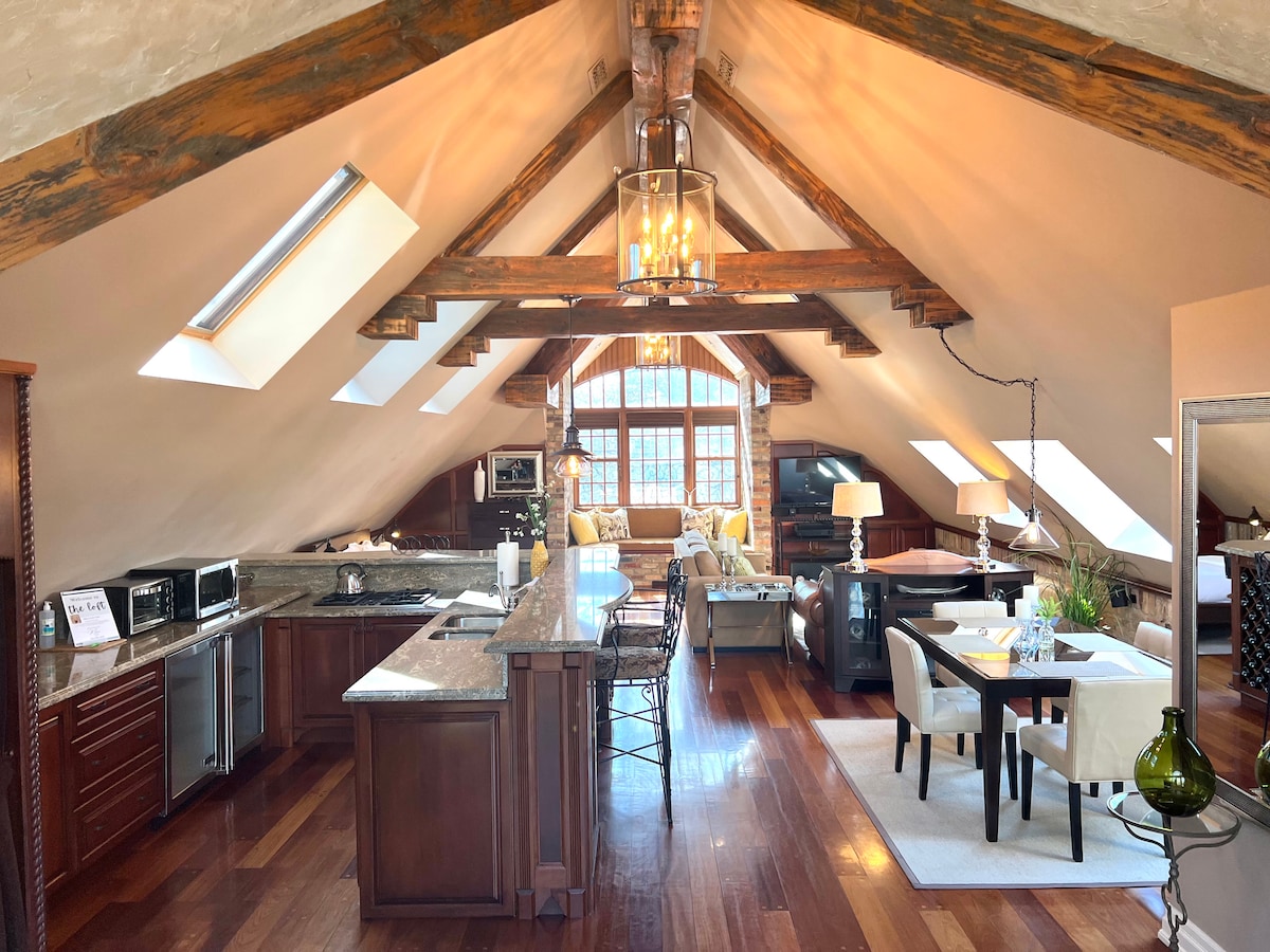 A private, open-concept loft apartment set on the top floor of a guest coach house on a quiet 2-acre waterfront estate. This spacious 1,000 sq ft loft is perfect for professionals seeking a peaceful, well-equipped place to stay during work assignments, relocations, home renovations, or longer visits to Mississauga.