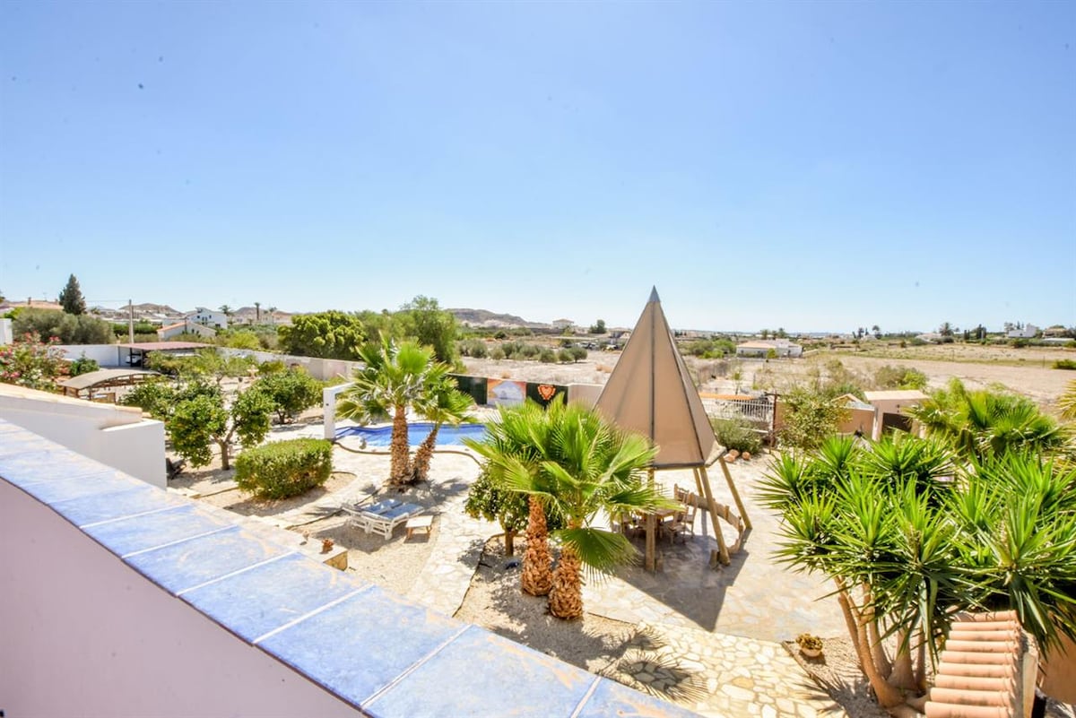 Vila 3 bilik tidur yang unik (almeriavilla) yang terletak di tengah-tengah Sierra Cabrera, dengan pemandangan 360º, menikmati matahari terbenam yang paling menakjubkan. Terletak hanya 20 minit dari laut biru pantai Mojacar, di mana terdapat pelbagai jenis bar & restoran untuk dipilih. Tempat yang tenang dan berehat, rumah ini mempunyai patio dalaman gaya Moor dengan kolam renang persendirian yang terletak di dalam batu, sesuai untuk menyejukkan diri pada hari-hari musim panas. Teres depan & beberapa balkoni lain dengan pemandangan gunung yang tidak terhalang.