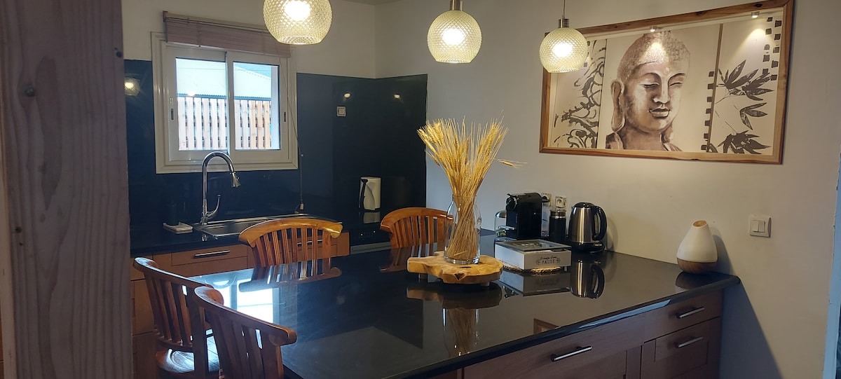 Tikaz Grand Bois di Saint-Pierre, di persimpangan kejiranan tipikal Tanah Suci, Tanah Merah dan Grand Bois.... 5 minit dari pantai yang paling indah di pulau ini, Grand Anse. Pemandangan laut, kolam renang persendirian, teres dan taman, kawasan letak kereta persendirian dan selamat. 1 bilik tidur 160 dan ruang pejabat. 1 ruang tamu dengan katil sofa (tidur berkualiti 140) , tv android besar, dapur lengkap, ruang makan dalaman dan luaran, bilik mandi penuh.