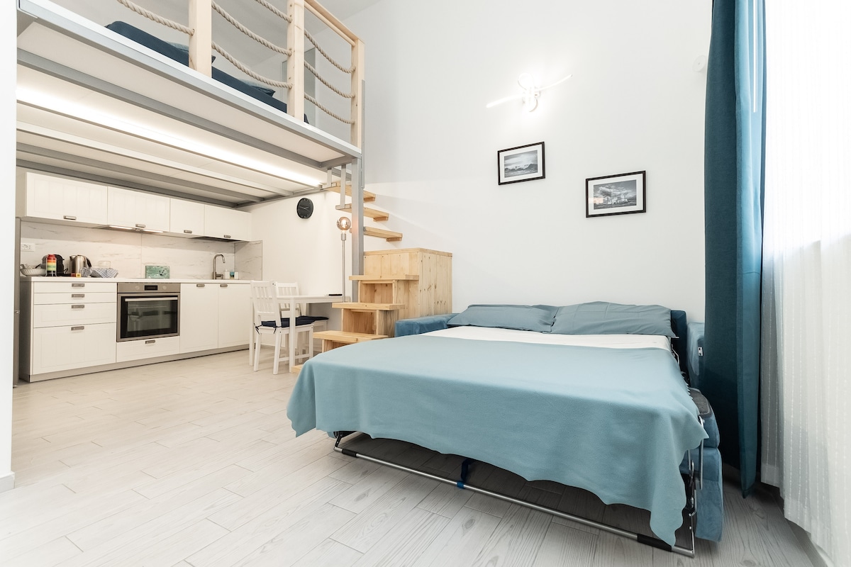 ->sesuai untuk pasangan dan/atau bekerja dari jauh dengan pemandangan laut - Katil dan meja dengan roda, anda boleh mengalihkannya sesuka hati anda - Tangga dan tempat letak kereta 10'tangga dengan berjalan kaki -chews dengan langsir gelap - teres kecil - TV ssmart 55"+kabel+juruwang+wifi - Peralatan senaman tersedia -lettofrancese 140x190 -lorong perimeter boleh laras - mesin basuh pinggan mangkuk, mesin basuh - Cadar,tuala,sabun, tisu tandas,minyak, garam dan lada