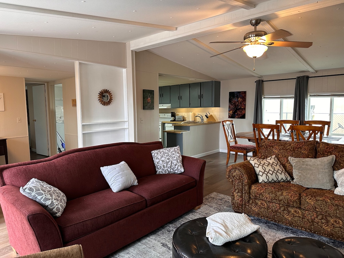 This roomy 3 bedroom / 2 bath house has 3 bedrooms with queen beds in each. There is a full kitchen, spacious dining area, and an office area. There are laundry machines in the unit. It is near the entrance to the KOA campground. Guests have access to the KOA amenities which includes easy access to an outdoor pool, pizza and wings in the store, a dog wash, playground and jump pad.