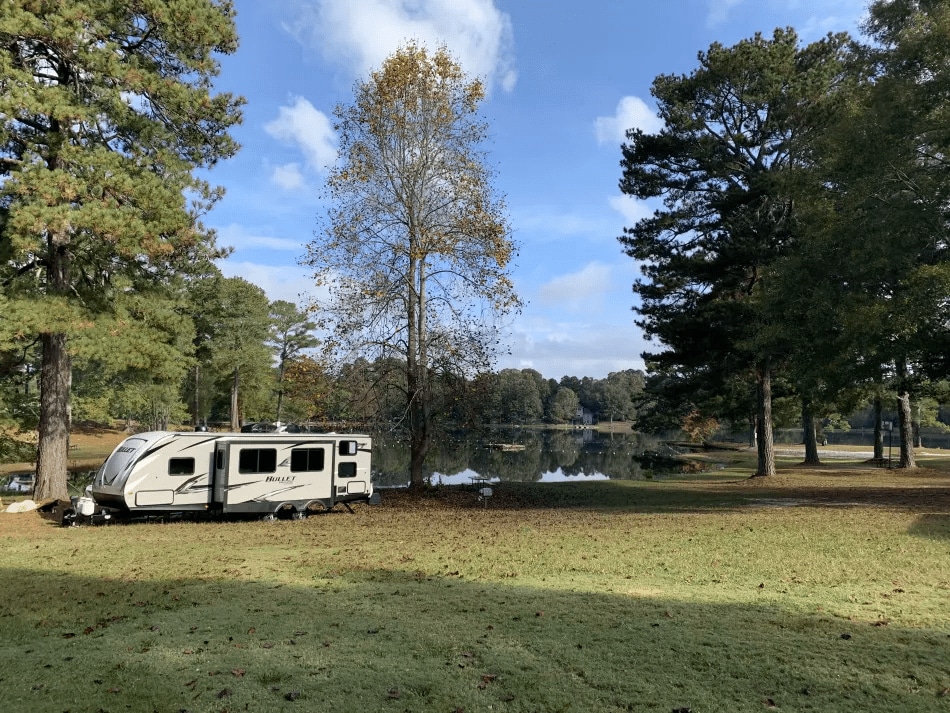 RV at the lake, boat launch, and tropical swimming pool.You will enjoy this quiet lake area , 100 yards from your RV complete with a large fire pit at the waters edge. great fishing , swimming and there are two kayaks you are welcome to enjoy! . Great for fisherman bring boats because ther is plenty of space to park your boat and trailer . Your Beautiful fully contained RV has a outdoor wonderful fire pit , Gas Grill and Charcoal grill. plus a great large table ,chairs and umbrella .