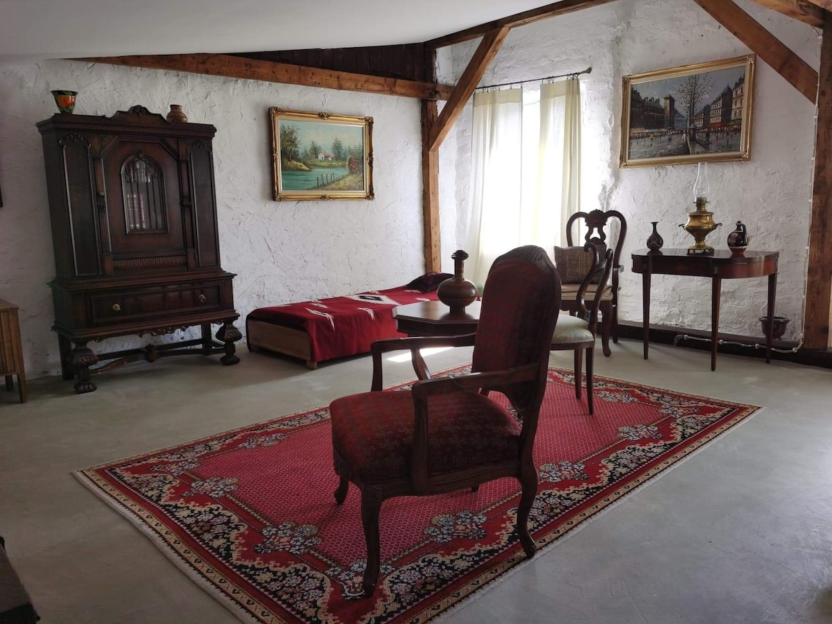 Loteng ini terletak di tengah-tengah. Berdekatan dengan pub, restoran, kedai dan taman air Apartmen ini terdiri daripada lobi, ruang tamu besar dengan dapur kecil, bilik mandi dari masa depan, dan bilik persalinan besar dengan meja Dapur ini mempunyai semua peralatan yang diperlukan: peti sejuk, ketuhar, kompor elektrik, cerek, pembuat kopi dan mesin basuh Ruang tamu mempunyai katil besar dan sofa bed Bangunan di mana loteng terletak berusia 200 tahun. Berdekatan ialah taman dan muzium kedai dobi Kami menjemput anda :)