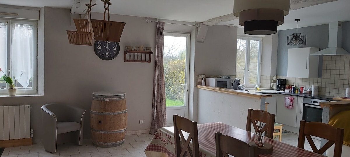 Rumah separuh kayu menawan seluas 60 m² yang terletak di kawasan desa. Tempat yang sesuai untuk mengecas semula bateri anda di tempat yang tenang dan hijau Hiasan desa dan kemudahan yang sangat lengkap Katil disediakan semasa ketibaan anda Kemungkinan daftar masuk sendiri Kedai dan restoran boleh diakses melalui kereta Direka khas untuk penginapan selama beberapa hari hingga beberapa bulan Baru: Rumah ini kini diketahui oleh Fiber yang membolehkan anda bekerja dalam keadaan baik