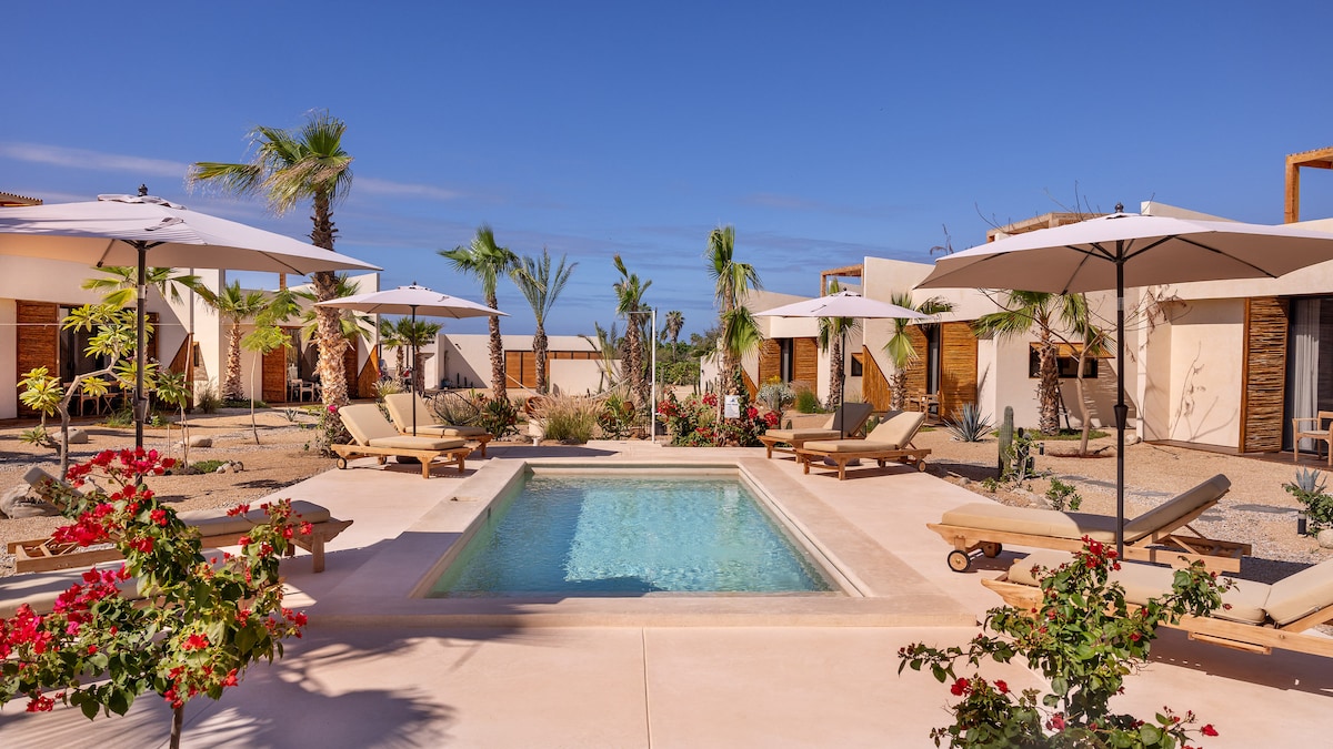 Enjoy the magic of Baja California Sur….. Relax in our beautiful Bungalow in a peaceful land surrounded by chili fields, mountain and sea view landscapes located in the bohemian commune of Pescadero. An area with endless stunning Pacific Ocean sunsets, which you can enjoy on your private alfresco dining roof terrace, fully equipped for your lounging afternoon with a great book, a glass of wine and sunset shows to take your breath away.
