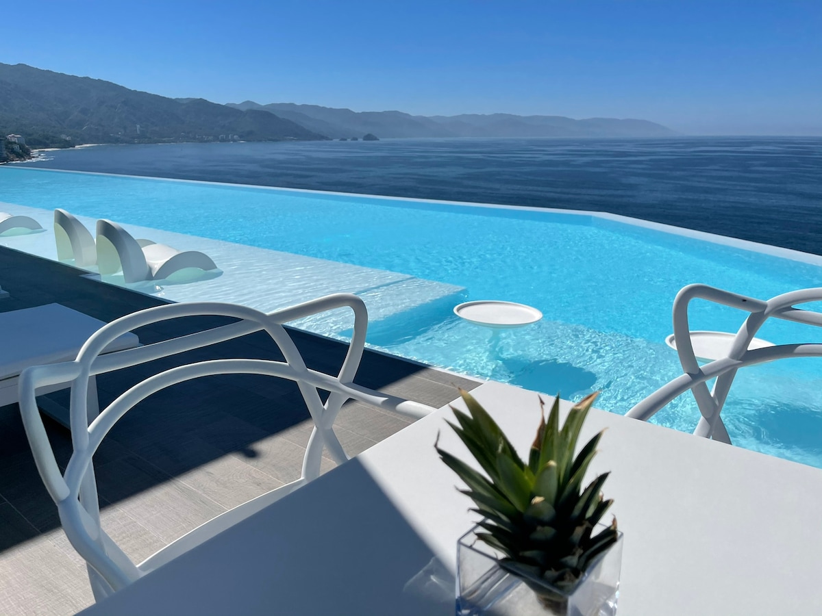 Pemandangan laut, matahari terbenam di atas bumbung, dan yang terbaik di Puerto Vallarta di depan pintu anda. Kondominium 1BR moden ini terletak tinggi di tingkat 11 Sail View 105 mewah di tengah-tengah Zona Romántica — tiga blok pendek dari Playa Los Muertos. Keluar ke kafe, galeri, kelab pantai dan hiburan malam... kemudian pulang ke rumah yang tenang, tinggi dan pemandangan Pasifik yang luas. Kopi pagi di balkoni anda, petang di kolam renang infiniti, malam menonton matahari mencair ke dalam laut — terapung di atas semuanya.