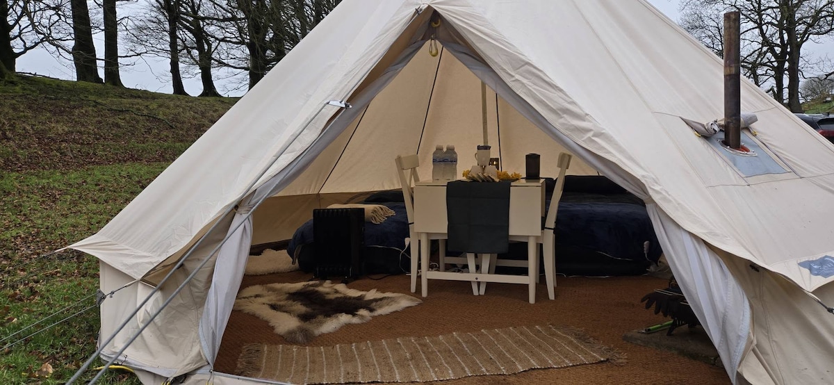 Get away from it all when you stay under the stars. Enjoy a peaceful glamping experience with us in one of our 5 metre bell tents (sleeps up to 4 people), in a stunning elevated location with incredible views, immersed in nature. The tent has a wood burning stove which can be used for cooking (firewood and cooking equipment/cutlery/crockery supplied), and there is also a firepit and picnic table for eating al fresco. You will also find a selection of books and games and a welcome pack.