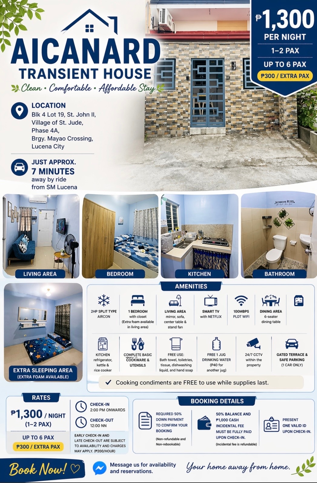Nikmati keselesaan, ruang dan ketenangan di seluruh kediaman selesa kami seluas 50 meter persegi yang terletak di Lucena City, Quezon. Bangun pagi dengan matahari terbit yang indah dan bersantai dalam suasana yang aman. Sesuai untuk berehat, memulihkan tenaga dan mencipta detik-detik yang tidak dapat dilupakan bersama orang tersayang anda. Kami juga menawarkan pilihan penginapan yang fleksibel untuk kumpulan yang lebih kecil. Hantar sahaja mesej kepada kami untuk tawaran tersuai yang sesuai dengan keperluan anda. Ada permintaan atau pilihan istimewa? Kami sedia membantu menjadikan penginapan anda lebih baik.