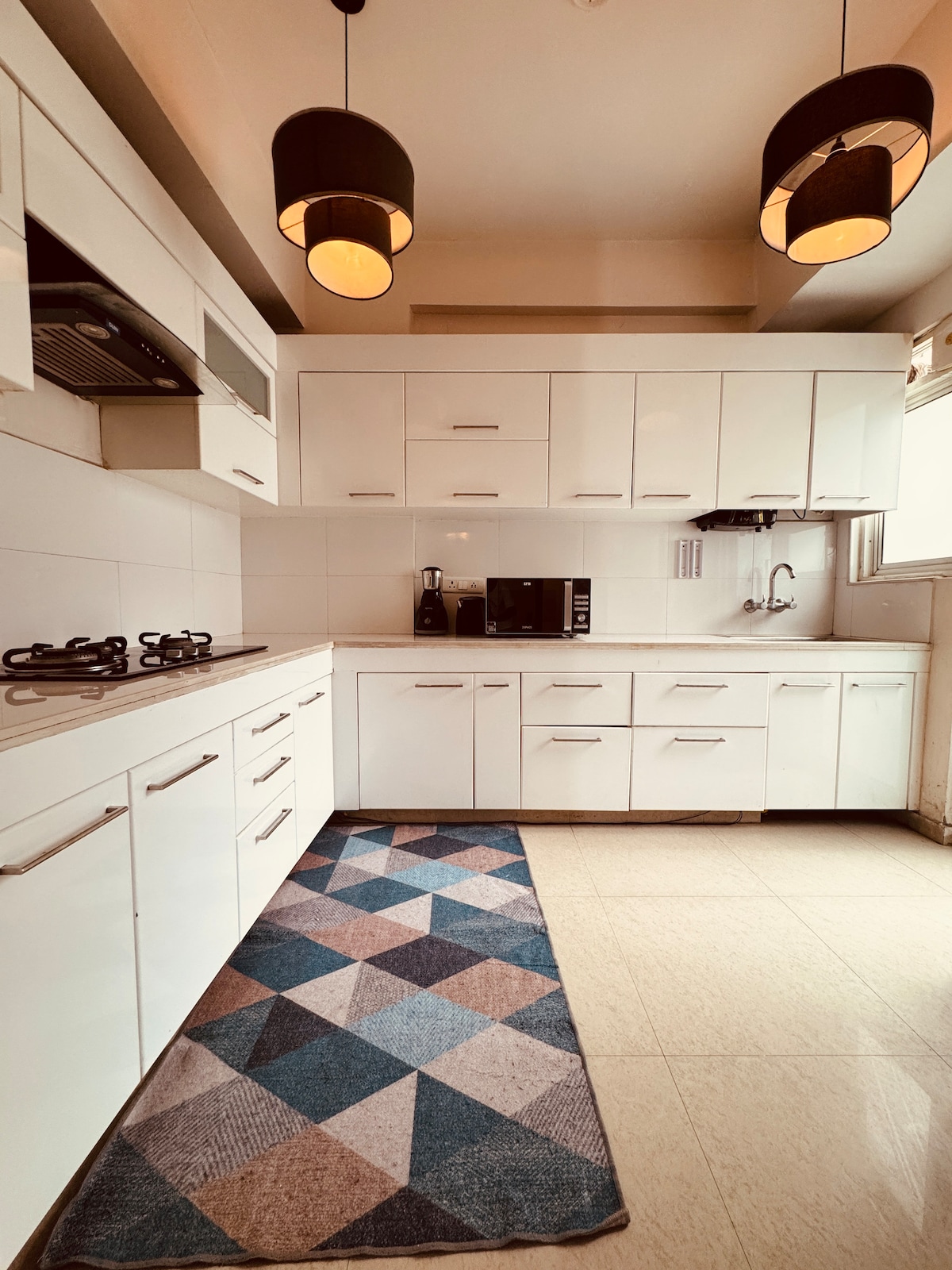 Masuk ke flat 1 BHK yang cerah dengan ruang tamu bergaya yang menampilkan siling marmar, kipas yang bergaya dan pencahayaan lembut. Kerusi baldu merah dan meja marmar gelap menawarkan tempat duduk yang selesa, manakala langsir biru kelasi dan krim membawa cahaya semula jadi. Nikmati persediaan TV pintar, hiasan elegan, dan dapur lengkap untuk memasak dengan mudah. Bilik tidur yang bersambung menambah keselesaan, menjadikan ruang moden ini sesuai untuk penginapan kerja dan percutian.