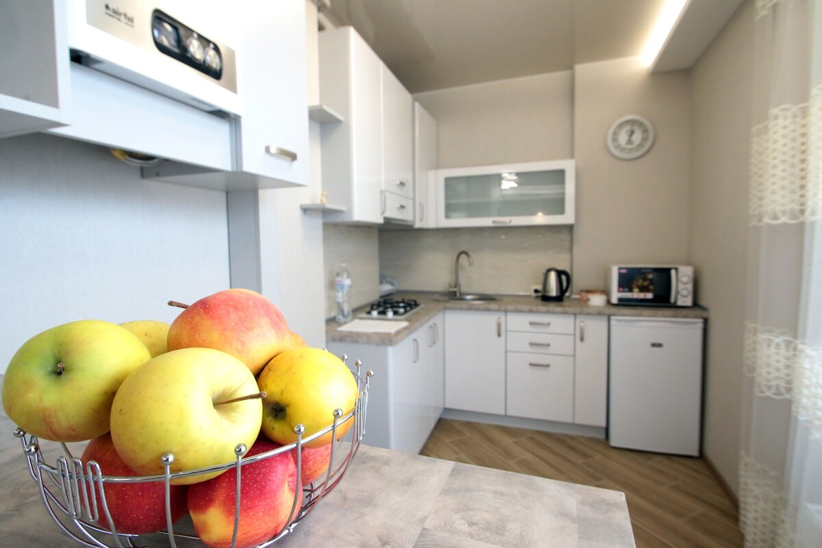Apartmen ini berada di tengah-tengah ,berhampiran Opera House. Bilik ini mempunyai 4 tingkap, bilik yang cerah, katil kelamin(160/200) dengan tilam ortopedik, sofa lipat, almari pakaian. Pembaikan baharu dibuat pada April 2021. Terdapat pasar raya yang betul-betul bersebelahan dengan apartmen. Pemanasan elektrik, dandang, lantai yang dipanaskan di dapur dan di bilik mandi. Wifi, TV(smart-tv)