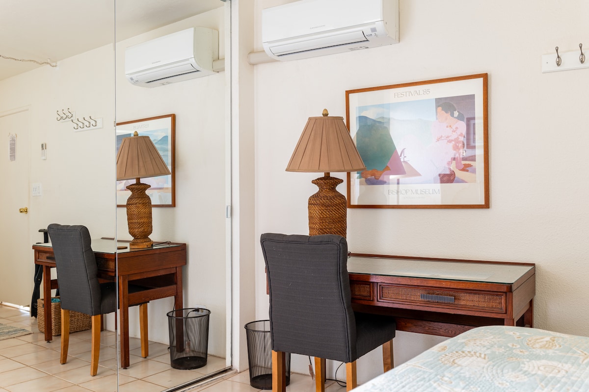 Harap maklum bahawa harga termasuk cukai! Kami harap anda menikmati syurga tropika yang tenang ini: cadar, barangan bilik mandi, bahan memasak, peralatan pantai (kerusi, papan boogie,) teropong untuk menonton ikan paus Wi-fi, ruang meja di bilik tidur, banyak DVD dan buku, permainan. Split A/C yang kami tidak pernah gunakan (kipas siling berfungsi dengan baik!) Kami mengalu-alukan orang daripada SEMUA pujukan dan budaya. Ini adalah bangunan LARANGAN MEROKOK/VAPE. DEKAT DENGAN MANA-MANA!