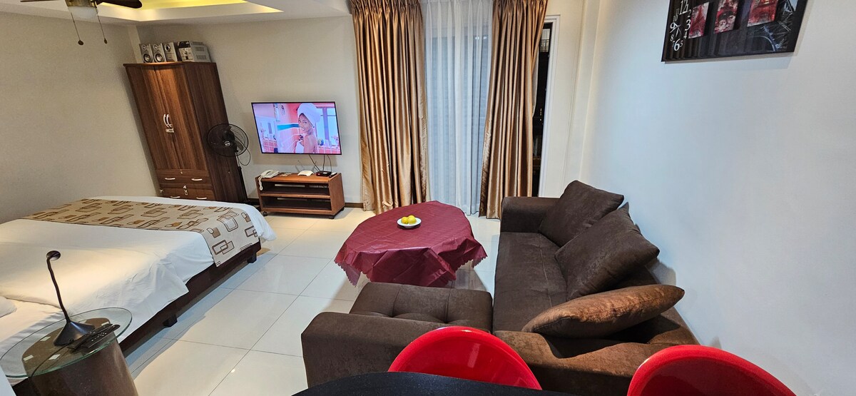 Experience a relaxing stay in this big, spacious and stylish 1-bedroom unit at Kandi Palace ( 8th floor ). Complete kitchen utensils Upgraded Big 2 TV Refrigerator Microwave oven Big Sofa Office table and chair Dining table and chairs Balcony table and chairs Cable, stream tv Fast WIFI White and blue lights Shower heater Water heater Fully Furnished Free Parking Area Rooftop access: Swimming pool Restaurant Closer to the action yet still quiet, perfect to relax 🌸