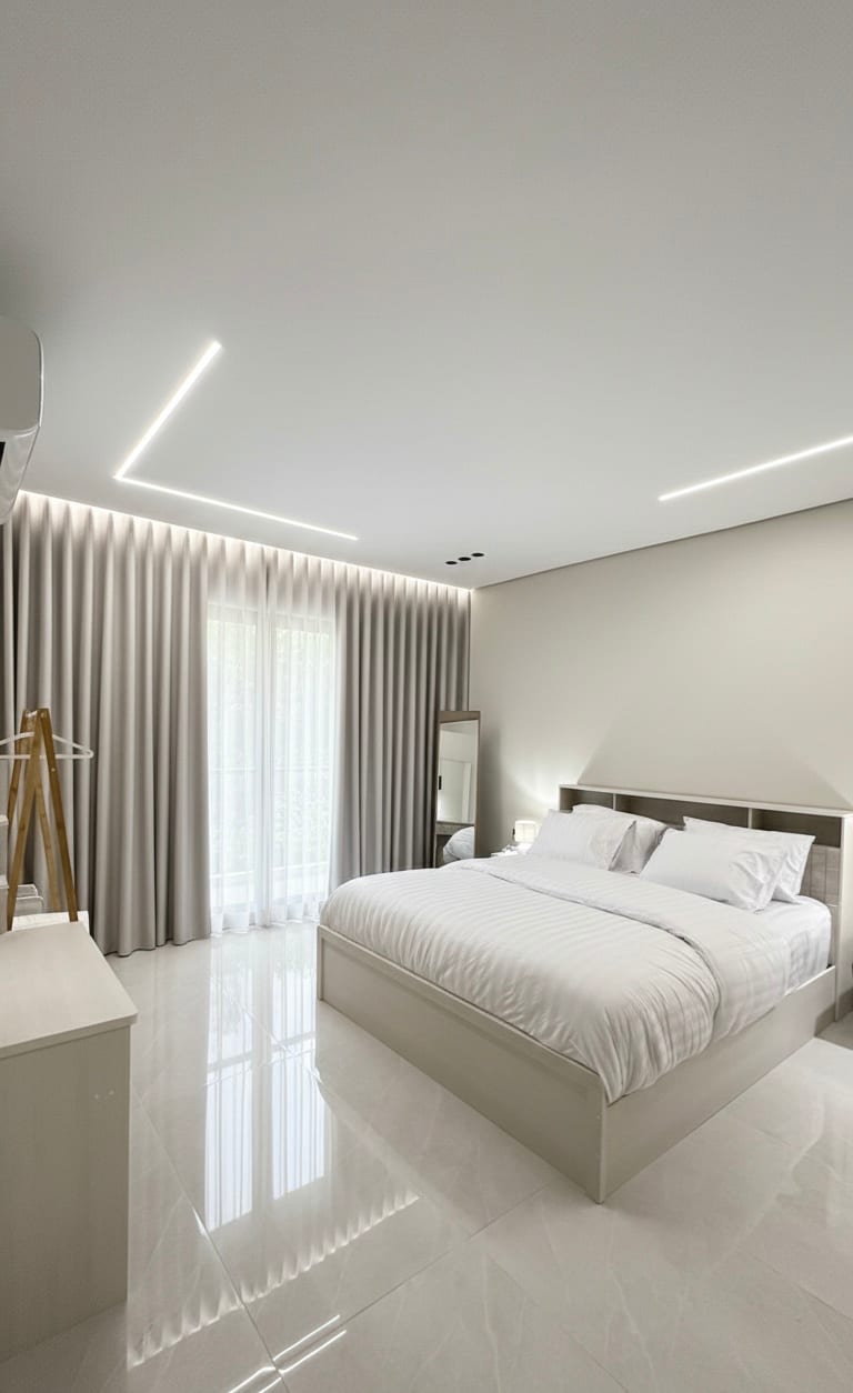 Apartmen yang lembut dengan bilik tidur dan ruang tamu yang tenang